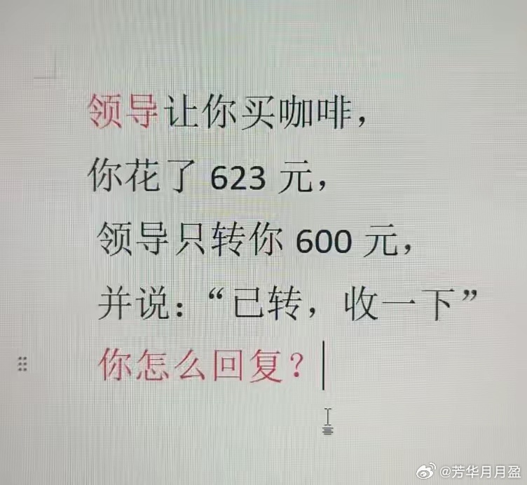 假如你领导让你买咖啡,你花了623元,领导只转你600元,并说:“已转,收一下。”此时高情商的你会怎么回复?