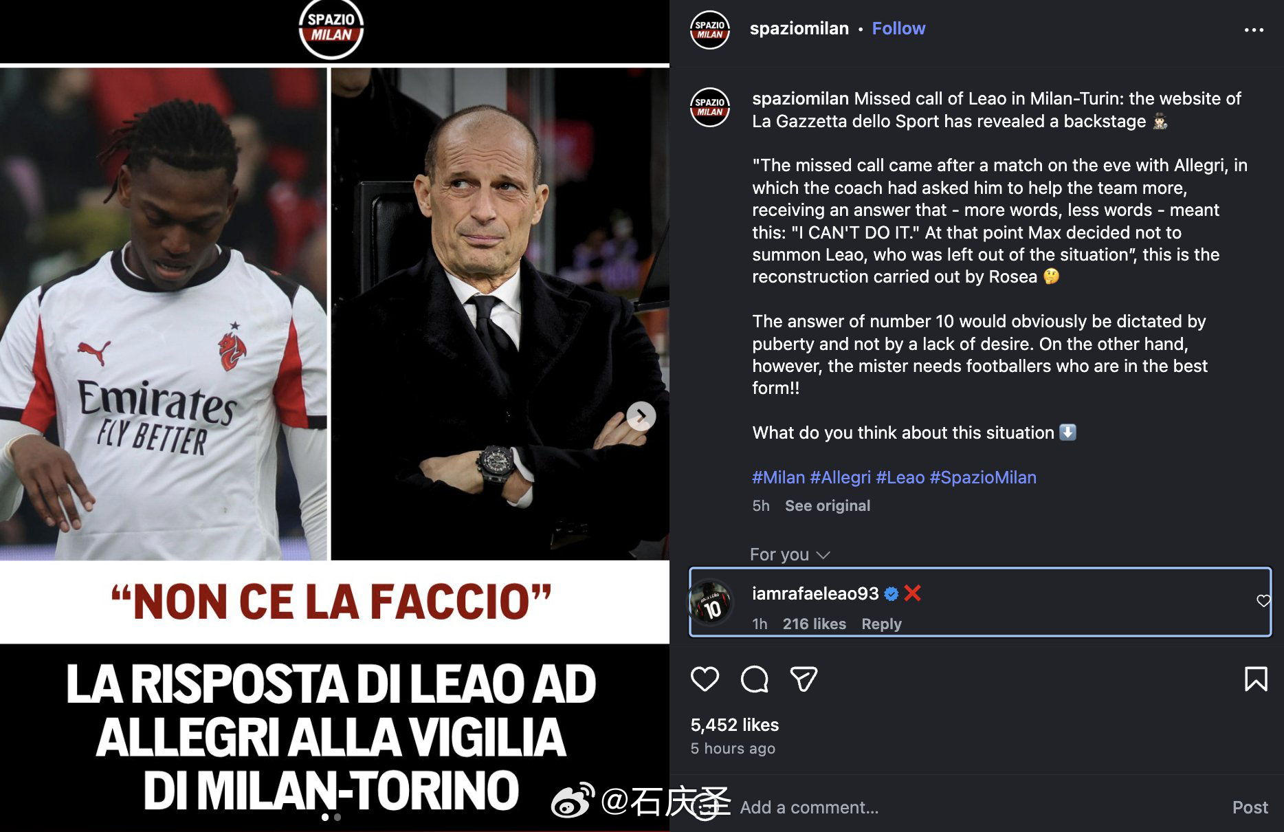 账号 spaziomilan:米兰对阵都灵赛前莱奥未被征召:《罗马体育报》网站披露了幕后故事。