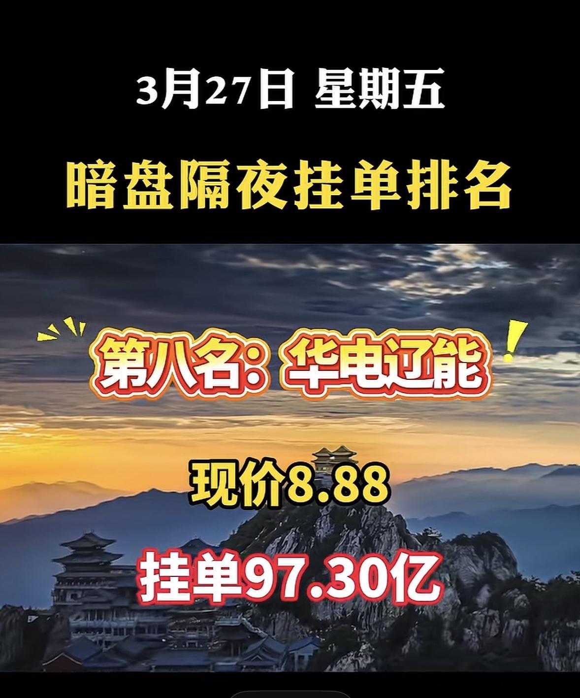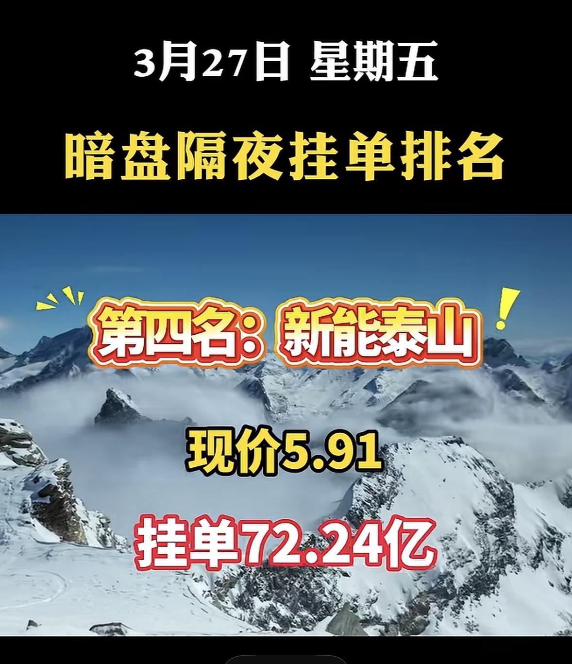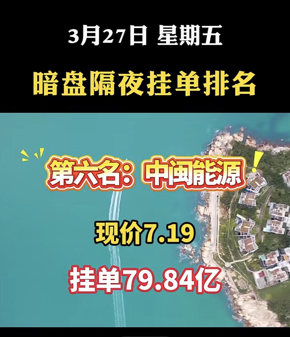 3月27日周五暗盘隔夜挂单排行榜出炉 华电能源这情况有点意思啊!现价6.77,挂单居然高达82.23亿,这数字看着就很震撼。暗盘隔夜挂单还排到了第七,这说明有不少人在关注它。 这么大的挂单量,说不定背后有大资金在布局。也许是看好华电能源未来的发展,可能是觉得它在能源领域有潜力。不过,股市这东西谁也说不准,这么高的挂单也可能带来一些不确定性。要是后续有资金持续跟进,股价说不定能往上冲一冲;但要是资金突然撤了,那也可能会有波动。总之,华电能源这波操作值得持续关注。