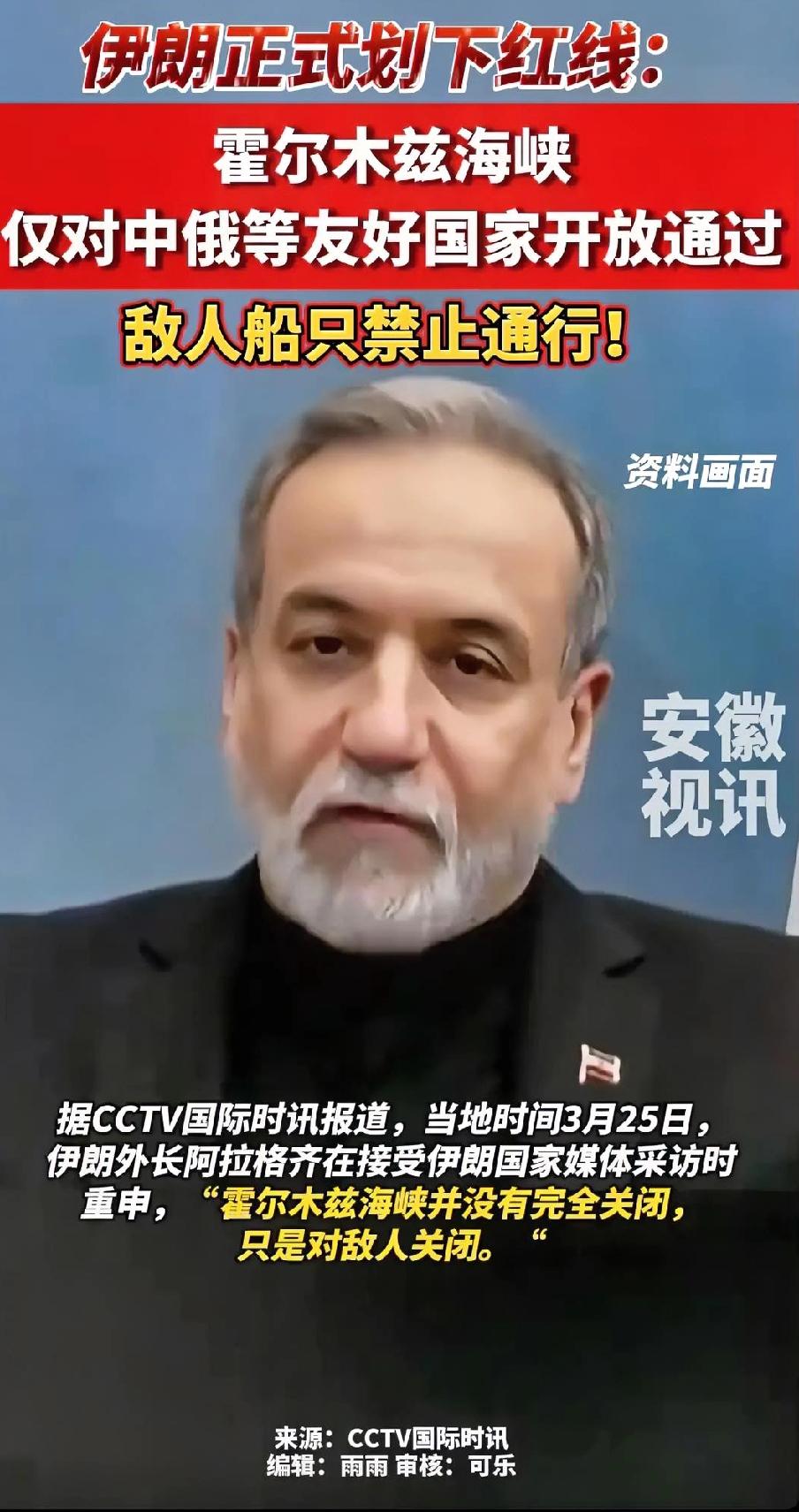 伊朗这步棋走得真绝! 最新消息, 3月25日,伊朗正式通知联合国,霍尔木兹海峡已对“非敌对船只”开放;随后,泰国、印度、俄罗斯等国的船只顺利通过,但美国和以色列的船只被禁止通行。 这下美国的盟友将面临两个选择:如果继续支持美国,盟友们将不得不冒着经济损失巨大的风险通过霍尔木兹海峡;而如果选择伊朗,将意味着美国及其盟友在中东的军事存在将遭到进一步削弱。 此外,伊朗还在第一时间提出要与中东国家建立一个不包括美国和以色列的“安全军事联盟”,显然伊朗此举是要表明,中东事务应该由中东国家自行管理,而不是让美国和以色列插手。 这一手操作,直接把美国在中东经营了几十年的霸权体系,撕开了一道大口子。很多人可能还没意识到,伊朗这不是简单的军事反击,而是一场精准的地缘政治斩首行动,目标直指美国在中东的根基。 霍尔木兹海峡是什么地方?那是全球能源的命门,全世界五分之一的石油都要从这里过,美国的欧洲盟友、日韩这些工业国,全靠这条航道续命。以前美国总拿封锁海峡威胁伊朗,现在风水轮流转,伊朗直接把规则改了,只堵美以,不堵别人。这招高明就高明在,它没有搞全面封锁得罪全世界,而是精准打击,把矛盾死死钉在美以身上,让其他国家不仅没理由反对,反而还得感谢伊朗保证了航道畅通。 美国的那些小弟现在最难受,骑虎难下。跟着美国混,自家的油轮、货轮过不了海峡,能源成本飙升,工厂停工、物价飞涨,国内老百姓第一个不答应。要是倒向伊朗,等于公开和美国翻脸,美军在中东的基地、驻军,还有那些所谓的安全承诺,瞬间就成了废纸。伊朗就是算准了这一点,逼着这些国家二选一,本质上就是在挖美国的墙角,拆美国的盟友体系。 更狠的是后面那个“无美以安全军事联盟”的提议,这才是伊朗的终极杀招。这么多年来,美国一直以“保护者”的身份赖在中东,卖武器、收保护费,把中东国家当提款机,把以色列的安全凌驾于所有阿拉伯国家之上。伊朗现在直接挑明了,中东的事,中东人自己管,不需要万里之外的美国来指手画脚,更不需要以色列在这耀武扬威。 这话直接说到了中东各国的心坎里。谁愿意常年被外国驻军控制?谁愿意看着自己的领土被别人说了算?伊朗借着这股强硬的势头,把“去美国化”的旗帜举了起来,相当于给所有中东国家递了一个抱团反抗的梯子。一旦这个联盟真的成型,美国在中东的军事存在就成了孤家寡人,再想指手画脚,门都没有。 有人说伊朗这是在冒险,其实恰恰相反,这是最稳妥的一步棋。伊朗手里握着海峡这张王牌,又有足够的军事底气和美国硬刚,现在顺势整合地区力量,把被动防御变成主动布局,一步步把美国挤出中东。反观美国,除了放狠话、搞制裁,根本拿不出实际办法,盟友离心离德,国内经济也扛不住能源价格上涨的压力,越拖越被动。 这场博弈打到现在,胜负的天平已经开始倾斜。伊朗用一套组合拳,既守住了自己的底线,又重构了中东的秩序,把美国的霸权嘴脸扒得一干二净。事实证明,靠武力威慑、靠霸权霸凌,终究走不长远,只有尊重地区国家的主权,让当地人主导自己的命运,才是大势所趋。伊朗怒怼美国 伊朗海峡危机