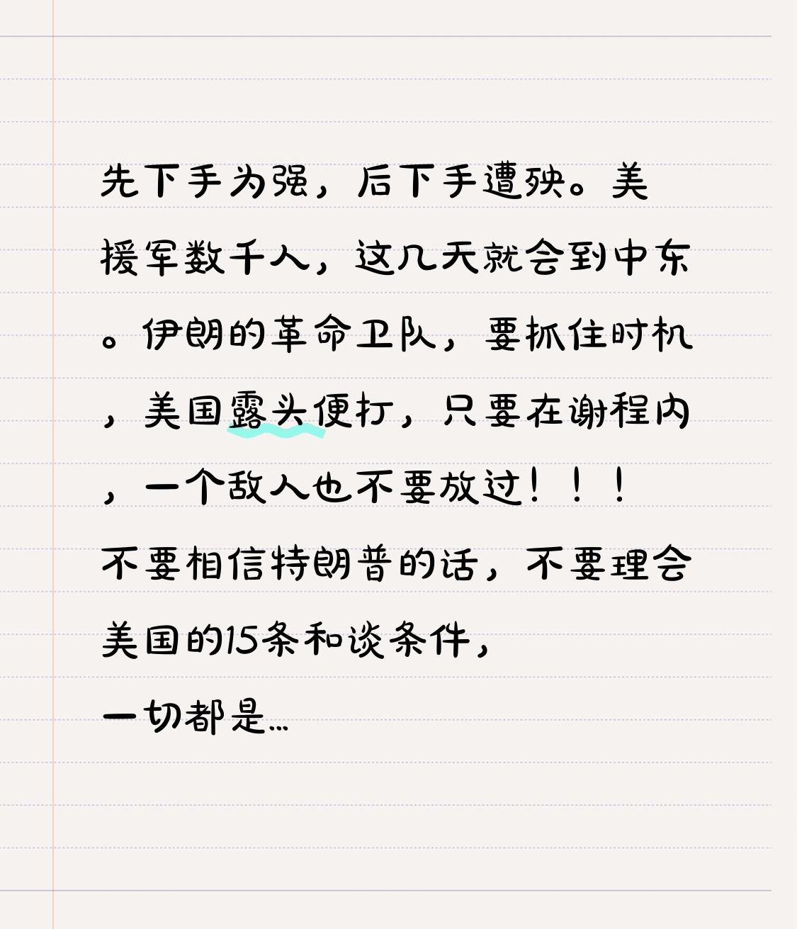 先下手为强,后下手遭殃。 美国数千援军,这几天就会抵达中东。伊朗革命卫队要把握时机,只要美国有所动作就予以打击,只要在射程范围内,一个敌人都别放过! 别轻信特朗普的言辞,也别理会美国提出的15条和谈条件,这一切都是烟幕弹!几千名士兵不远万里奔赴中东所为何事?其一,是为了施加压力;其二,是妄图消灭伊朗现政权,不要对美国抱有任何幻想,真理就在大炮射程之内! 对待美军,依旧是先下手为强,后下手遭殃。