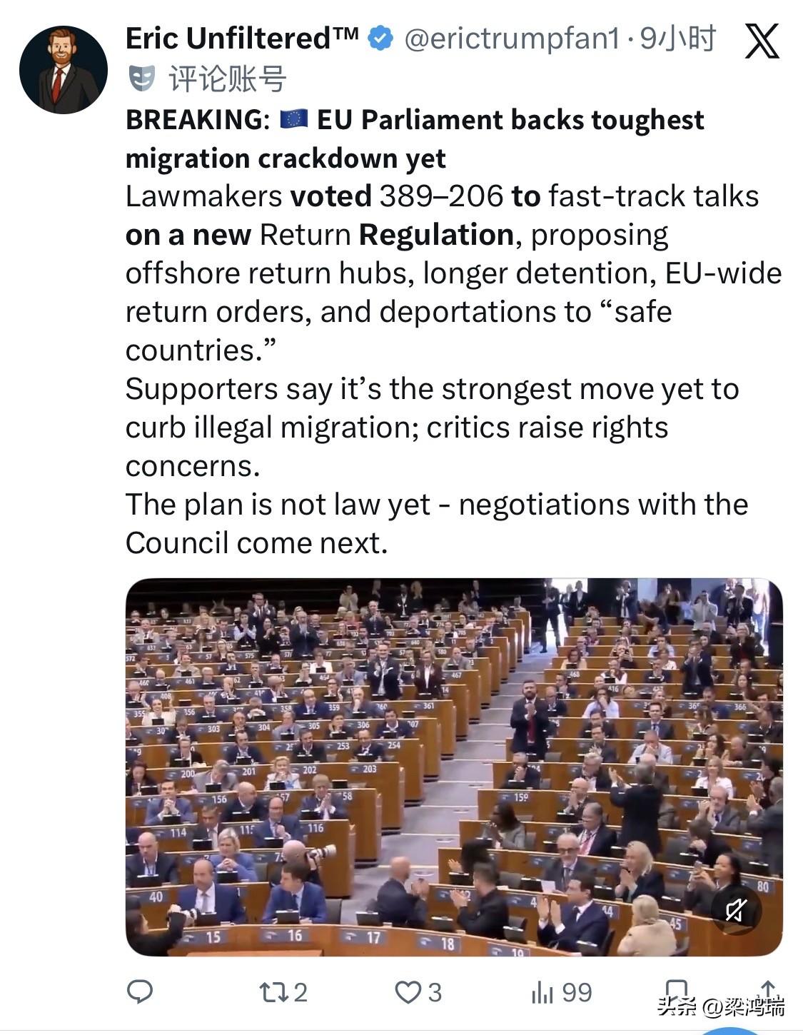 欧洲议会于 2026年3月26日 投票通过了一项关于非法移民遣返的新法规,进一步收紧了欧盟的移民政策。 这项决议是欧盟《新移民与庇护协议》的重要补充,主要内容和背景如下: 核心决议内容 简化遣返程序:新规(Return Regulation)旨在提高遣返效率,使成员国能更快速地将非法滞留者和庇护申请被拒的人员遣返回原籍国或“安全第三国”。 设立“遣返中心” (Return Hubs):批准在欧盟领土之外的第三国设立移民中心。面临遣返的非法移民可被送往这些中心进行拘留和处理,而无需留在欧盟境内等待。 强制团结机制:所有成员国必须在处理移民问题上分担责任,要么接收分配的庇护申请者,要么通过财政(如每人 20,000 欧元)或人员支援做出贡献。 扩大“安全国家”清单:欧盟建立了一份统一的“安全国家”名单(如孟加拉国、印度、埃及等)。来自这些国家的申请者将面临自动不予保护的推定,并进入加速审理和遣返程序。 政治背景与实施时间 政治转向:该法案由欧洲议会中的中右翼(如 EPP)和极右翼政党联盟推动,反映了欧洲政治整体向右转的趋势,旨在通过严厉手段恢复对边境的控制。 生效日期:虽然决议现已通过,但《新移民与庇护协议》的大部分条款(包括强制团结机制和更严格的边境审查)预计从 2026年6月 起正式全面实施。 目前,这一决议在欧洲内部引发了激烈讨论。支持者认为这是“欧洲觉醒”和恢复法治的标志,而人权组织和左翼团体则批评这会导致移民政策“去人性化”,并对庇护权构成威胁。