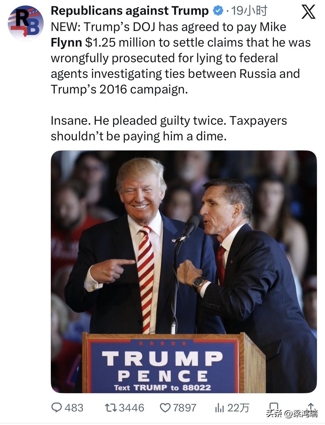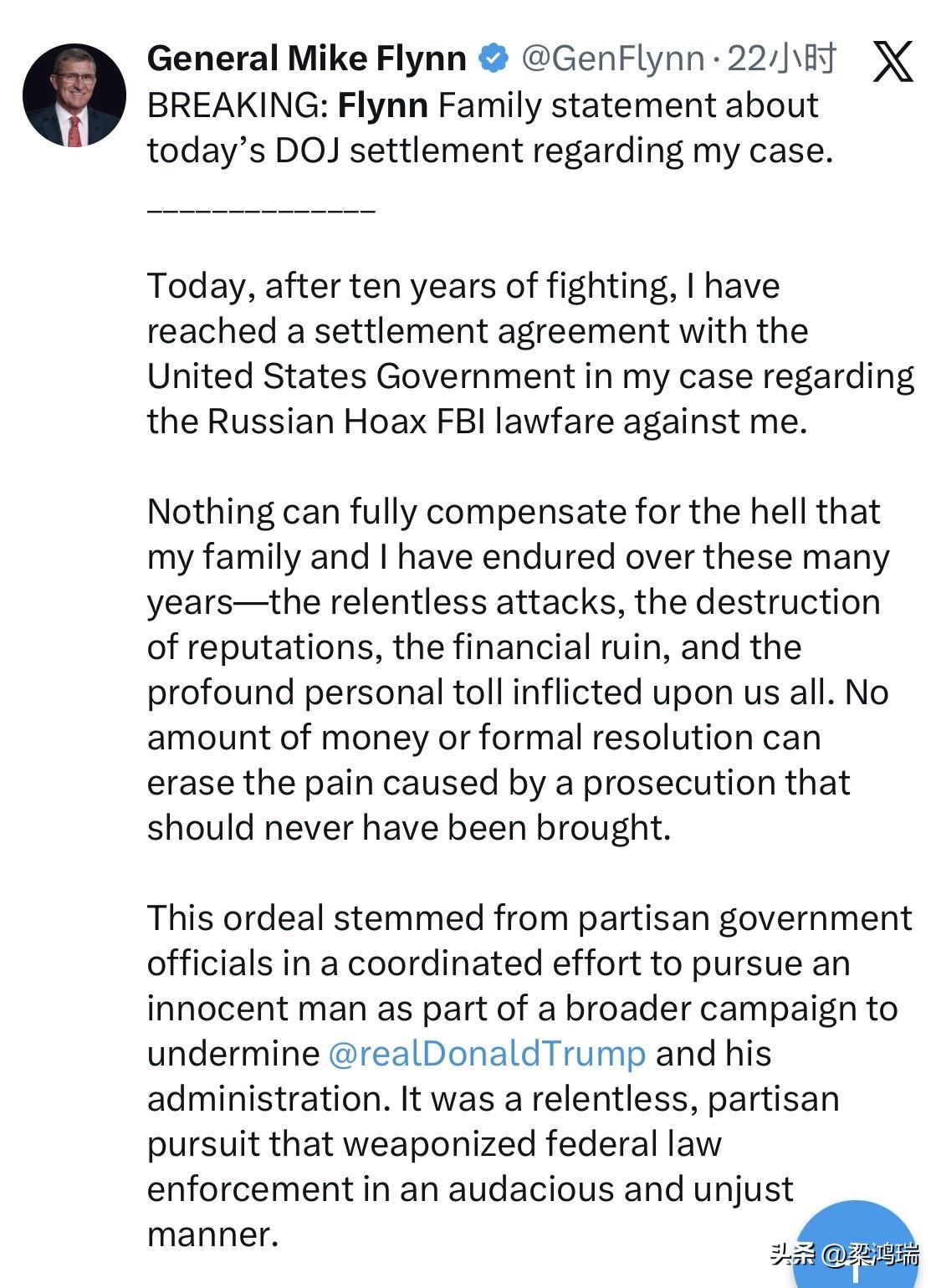 今天美军退役中将弗林发推,宣布与美国司法部达成和解协议,从而结束他遭政治迫害的案件。弗林在“通俄门”事件中被指控,其实就是左派民主党与当时的共和党副总统彭斯合伙陷害他。左派恨他,因他是第一个美军退役将领站出来支持川普选总统(2016)。弗林军衔很高,是退役中将,而且之前担任国家情报局局长。他支持川普,在军界、情报界都有很大影响;尤其他服役33年,对140万美国官兵有感召力。所以左派恨死他了。 再一个,弗林的家族一直支持民主党,他本人也注册民主党,但在2016年弗林认识到奥巴马、希拉里等祸国殃民,所以他挺身而出,坚定支持川普选总统、拯救国家! 他的军中地位,他的民主党背景,都让左派恨得牙痒痒的。 川普当选总统后,任命弗林将军担任国家安全顾问。在川普还没有就职前,弗林与俄国大使有过一次通话,被左派抓住,诬陷他“通俄”。当时的副总统彭斯(建制派)谗言,中间使坏,最后弗林被迫辞职。 在最初司法部对弗林通俄的调查中,迫于彭斯的压力(也为了维护川普总统),弗林同意“认罪”,承认自己与俄国大使通话,没有事先通报、不合适。 后来弗林推翻了认罪,坚持自己没有任何“通俄”。 2020年,司法部撤销了对弗林将军的通俄案件。 2023年,弗林告了司法部,索赔5000万美元。今天与司法部达成庭外和解,但具体的赔偿额没有公布。由此弗林将军案件,得以昭雪。 弗林将军今在推文中说:“10年来,我的家人和我所遭受的苦难是无法完全弥补的——持续不断的攻击、名誉的毁坏、经济的崩溃,深深的精神创伤。无论投入多少金钱,无论通过何种正式方式解决,都无法抹去这场本不该发生的诉讼所带来的痛苦。” 弗林说:“这场迫害事件源于政府内部的党派官员们协同行动”。 这个内部党派官员,可能就是指后来被保守派称为“犹大”的彭斯(副总统)。 弗林说,迫害他的行动,是“更大阴谋的一部分”,这个更大阴谋,就是破坏川普总统及其政府。 弗林的推文最后说:“这份和解决议虽然尚不完美,但确实终结了这一不公正的篇章。”