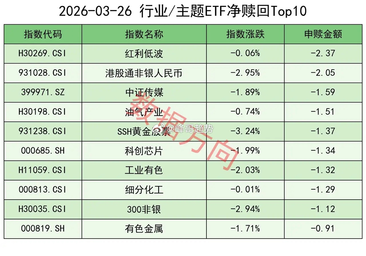 其他进入赎回榜的还有:中证传媒指数(-1.59亿)、油气产业指数(-1.51亿)、SSH黄金股票指数(-1.37亿)、工业有色指数(-1.32亿)、细分化工指数(-1.29亿)、有色金属指数(-0.91亿),多以资源品为主。