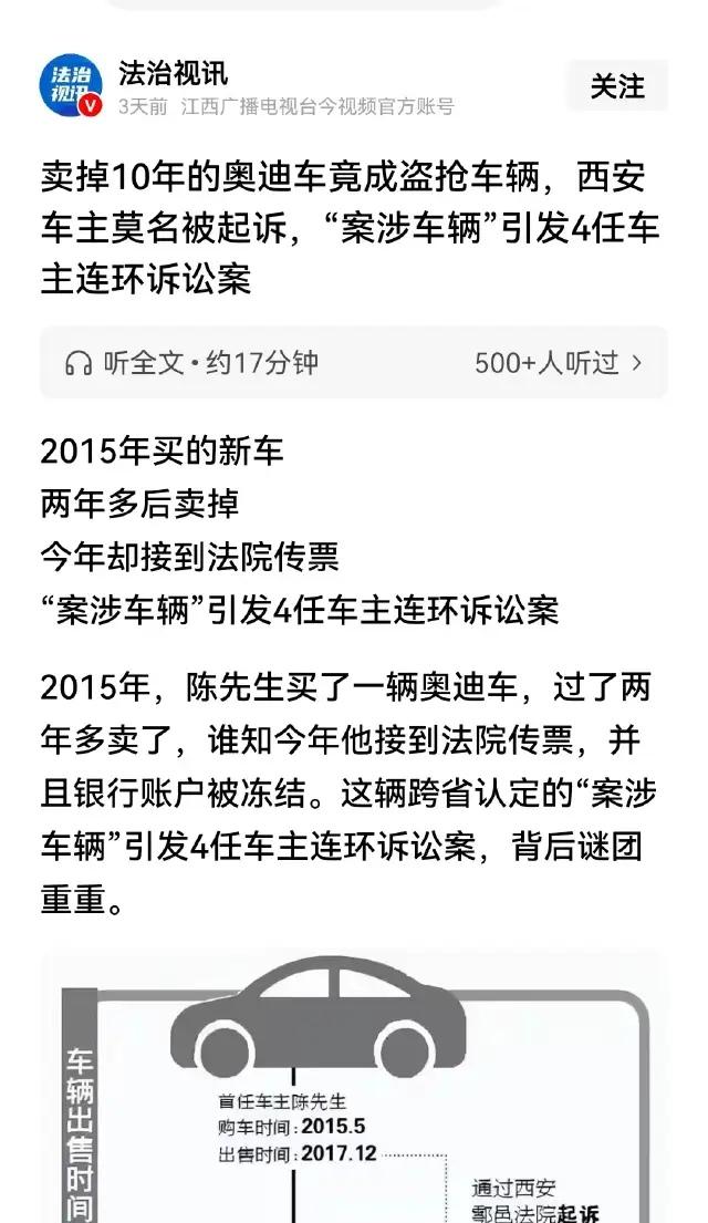 陕西西安,陈先生11年前190000元买了一辆奥迪,两年后卖给了二手车行,2026年1月初,陈先生突然接到了一张传票,称他当年那辆车是偷的,还把他的账户冻结了。陈先生气坏了:我在4S店提的新车,怎么可能是偷的? 说起这件事,陈先生就一个头两个大,莫名其妙出现的这场官司,将他的生活彻底扰乱了。 一张冰冷传票,打破了平静生活。电话那头法院工作人员语气严肃,告知他因买卖合同纠纷被起诉,涉案车辆竟是盗抢车。陈先生当场懵了,反复确认是不是同名同姓搞错了,直到电子版文书发来,姓名、身份证号、车辆信息一字不差,他才意识到,这场无妄之灾,真的落在了自己头上。 更让他崩溃的是,法院依申请冻结了他名下银行账户,近20万资金动弹不得。房贷、车贷、孩子学费、老人医药费全靠这些钱周转,一夜之间,家庭开支彻底停摆。他跑银行、跑法院,得到的答复都是按程序办事,想解冻必须先应诉自证清白。 11年前的购车场景,陈先生至今历历在目。他拿着全款在西安正规奥迪4S店提车,购车发票、车辆合格证、机动车登记证书一应俱全,车管所顺利上牌,所有流程光明正大,全程无任何违规。2017年他通过正规中介卖车,签署合同、办理过户,车管所完成档案变更,手续闭环无漏洞。 一辆合法新车,为何在辗转四任车主、时隔近十年后,突然被定性为盗抢车辆? 真相逐渐浮出水面。云南一名车主早年报案车辆被盗,车架号与陈先生这辆车高度吻合。车辆几经转手到第四任车主手中时,被警方查获扣押,直接发还给报案人。后续车主车财两空,层层追责,最终将矛头指向第一任车主陈先生,把他告上法庭索赔全款。 陈先生彻底愤怒:我既不认识云南报案人,也从未接触过所谓被盗车辆,全程守法购车、合法转卖,凭什么为别人的纠纷买单?凭什么用我的合法财产,填补他人的损失漏洞? 此事曝光后,网友瞬间炸锅。有人直言:太离谱了,正规4S店、车管所双重把关,都能冒出盗抢车身份,普通人买车还有安全感吗?也有人共情:卖出去近十年的车,还要原车主负责,这锅背得太冤。还有人质疑:车辆身份信息为何能出现重合?中间是否存在车架号篡改、信息录入错误等问题? 这起荒诞案件,戳中了无数普通人的痛点。我们买车卖房、做日常交易,都默认正规平台、官方手续是安全屏障,可当多年前的合法交易,突然因不可控的第三方问题被追责,普通人该如何自保? 陈先生如今四处奔走,整理全套购车、过户证据,积极应诉自证清白。他只想要一个公道:合法公民不该为莫须有的罪名担责,更不该为他人的纠纷牺牲正常生活。 我们常说法律公平正义,可当无妄之灾从天而降,普通人的维权路往往布满艰辛。一辆车,牵扯四任车主、跨省纠纷、身份谜团,背后暴露的不仅是车辆管理漏洞,更是普通人面对连环诉讼的无力。 到底是车辆信息乌龙,还是有人暗箱操作?正规流程为何挡不住多年后的追责?陈先生的账户何时能解冻?这场跨越十年的闹剧,该由谁来真正负责? 你觉得陈先生该承担责任吗?普通人遇到这种事,该怎么保护自己?评论区留下你的看法。