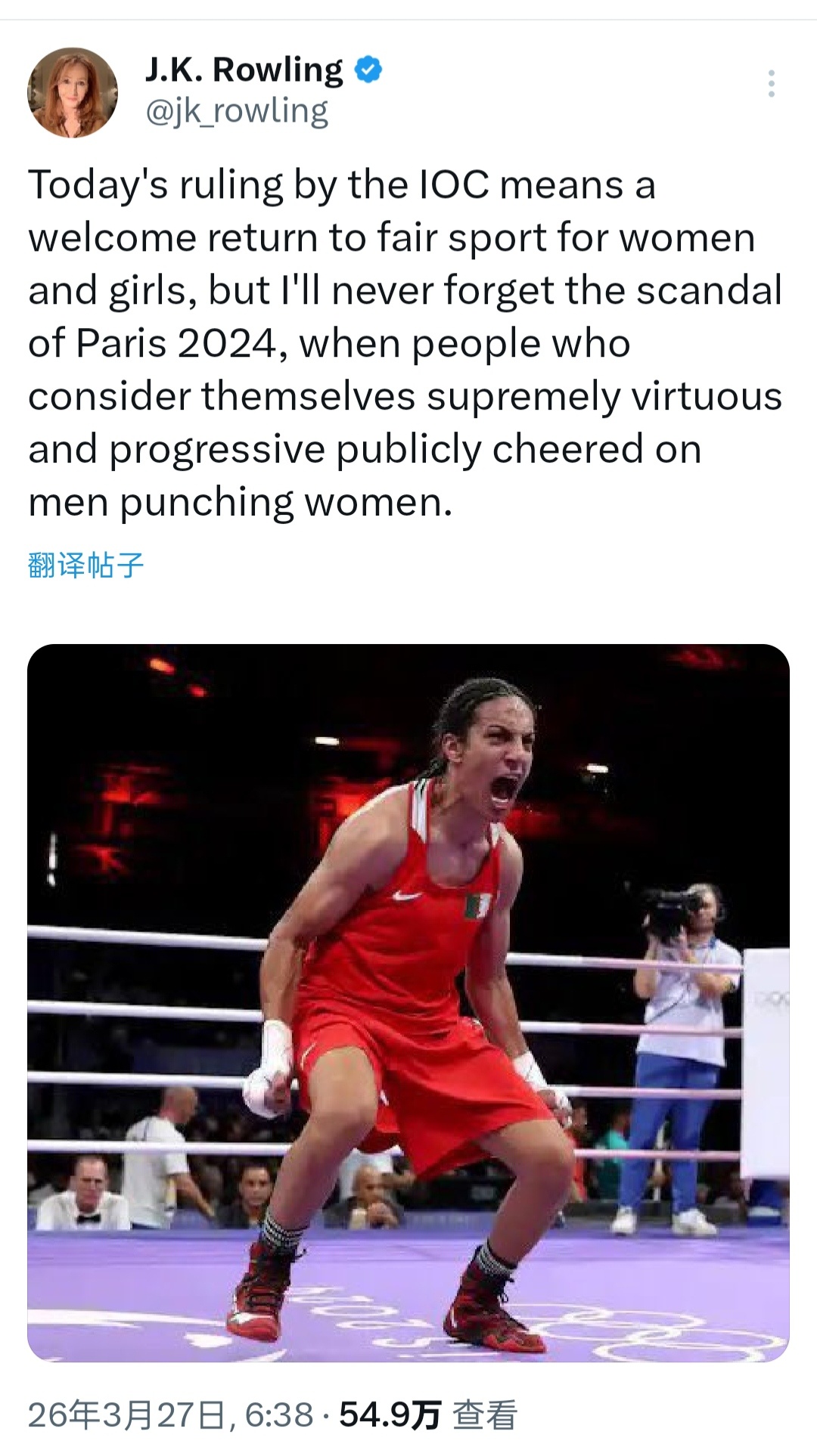 JK罗琳的帖子配了阿尔及利亚拳击选手哈利夫的照片。在2024年巴黎奥运会女子66公斤级拳击决赛中,哈利夫击败中国选手杨柳获得金牌。