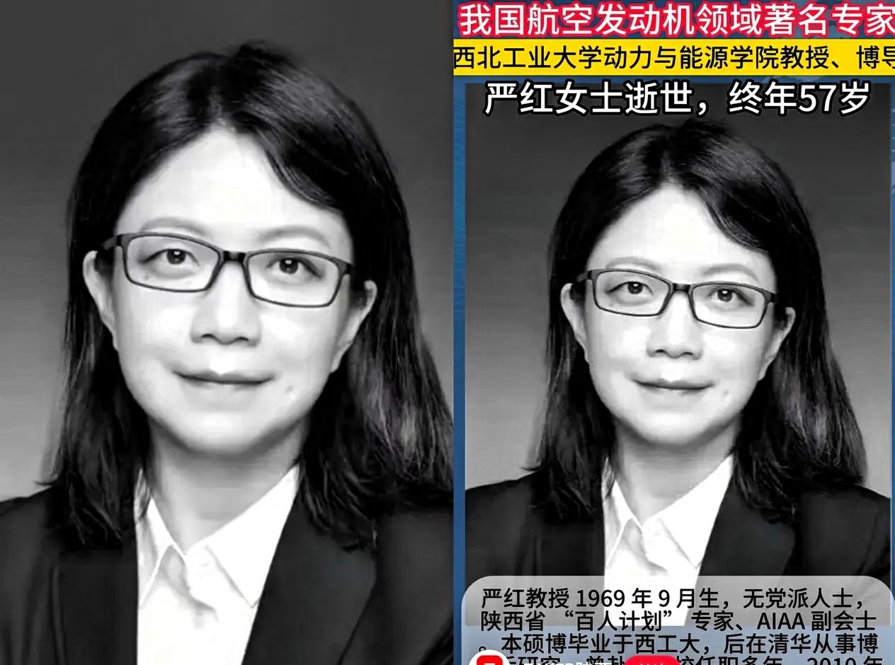 又一位大人物去世了! 她的离开更令我震惊,她就是我国航空发动机领域著名专家严红! 严红是西北工业大学博士生导师,长期从事航空发动机相关研究,这一领域技术难度高,也是我国重点发展的关键方向。她在专业领域深耕多年,曾放弃海外较为优越的条件选择回国,多年来坚持在科研和教学一线,既参与技术攻关,也培养了不少专业人才,为我国航空发动机事业发展作出了自己的贡献。 57岁本是科研人员经验成熟、适合持续开展研究的阶段,她的离世,是所在研究领域的一大损失。 如今网络信息繁杂,公众视线更多集中在娱乐话题和流量热点上,许多默默奉献的科研工作者并不为人熟知。他们日常专注于研究和工作,很少出现在公众视野,也不追求个人名气与利益,只是踏踏实实在自己的岗位上完成职责。 相比于追逐热点,真正值得我们关注和尊重的,是这些为国家科技进步踏实付出的人。他们的工作看似远离日常生活,却实实在在支撑着相关领域的发展,为国家实力提升打下基础。 尊重科研人员,铭记他们的付出,不仅是对个体的致敬,也是社会应有的价值导向。真正的国家发展,离不开一代代科研工作者的坚守与积累。 他们平凡而坚定的付出,值得被更多人看见与尊重。