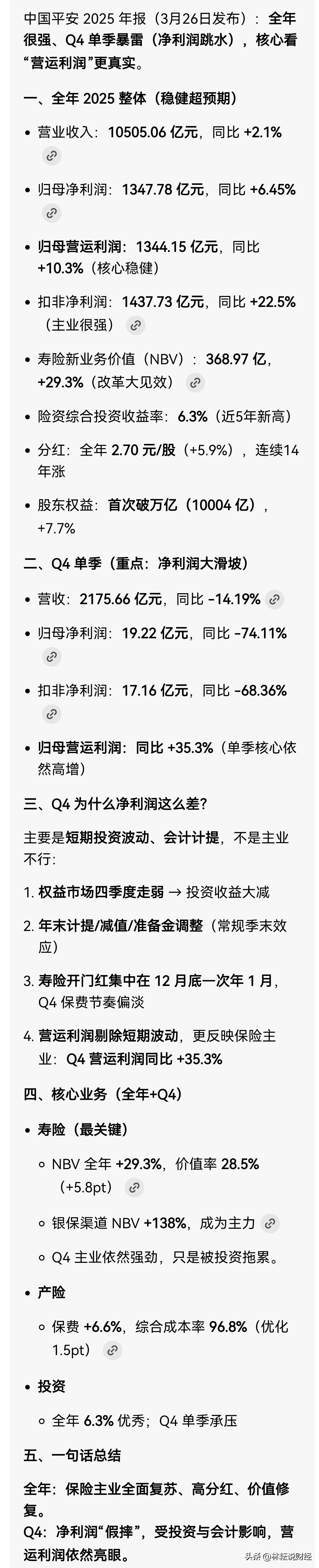 中国平安年报总体尚可,但去年Q4表现欠佳,在预期中,提示过。中国人寿去年Q4一样一塌糊涂。 保险公司绑定银行股做业绩,软饭硬吃,风险敞开不小。