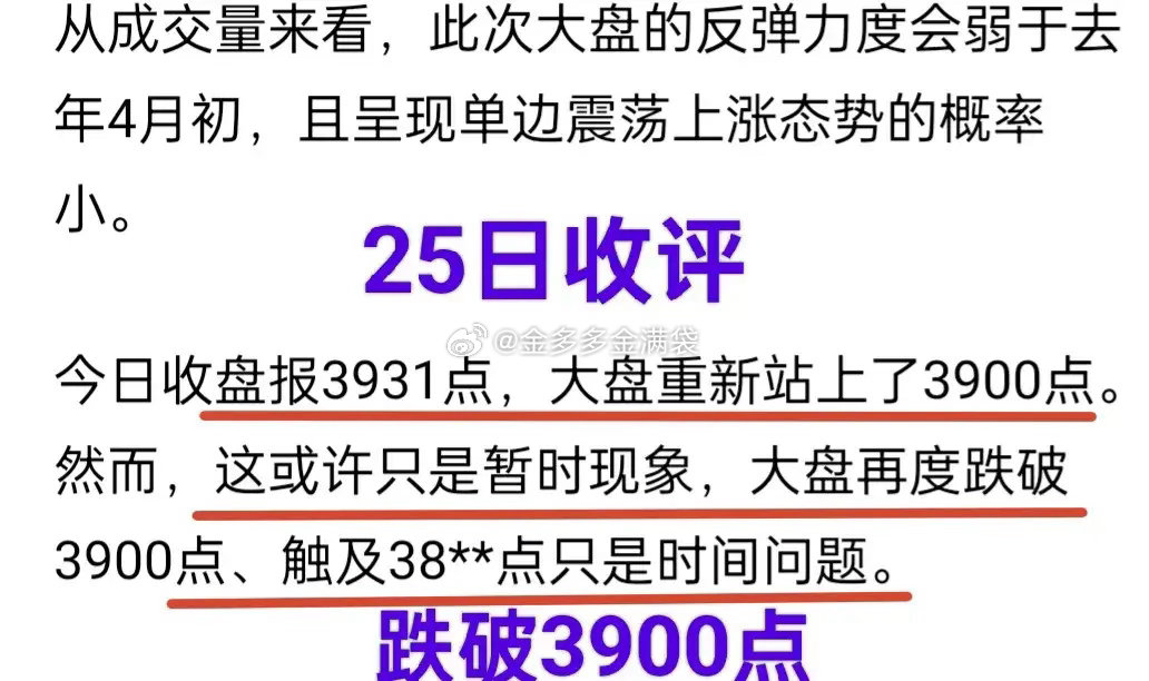 A股:市场较疲弱,隔夜外围市场普跌,今天大盘是低开低走还是先抑后扬呢?周三收评,金姐讲过,3900点守不住。