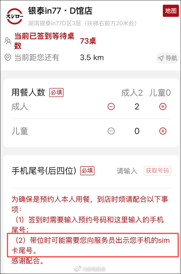 【“前方等位3000桌”,有黄牛一个号150元!#寿司郎新规就餐要看SIM卡尾号#】近日,有网友发文称,在寿司郎小程序预约取号后,到店签到需要核验手机尾号后4位,并出示手机SIM卡尾号。