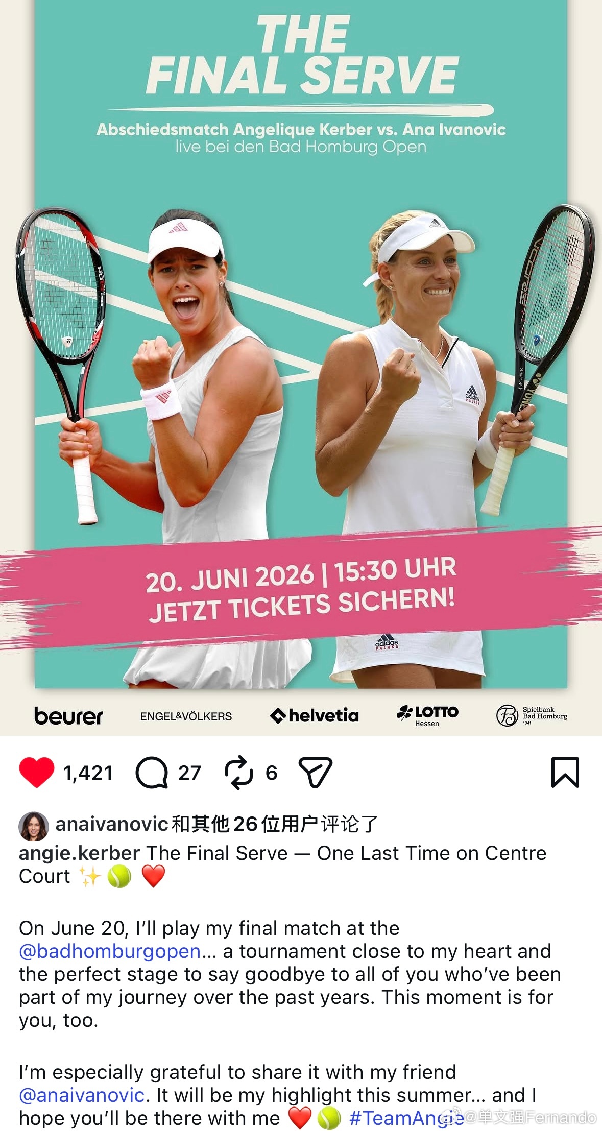 科贝尔🤝伊万诺维奇🔥最后一舞Angie官方宣布,会在今年6月20日草地赛季巴特洪堡中心球场打一场!wta