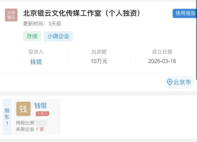 钱锟成立个人工作室了钱锟成立个人工作室北京锟云文化传媒工作室~期待在内地的个人
