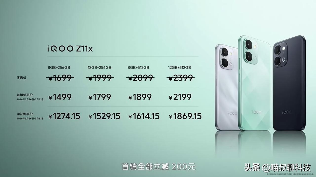 今年的中低端新机是真没啥看头了... IQOO Z11 的价格虽然依旧是1999起,但强行改到了8+256G的版本,而且12+256G和12+512G之间的价差达到了500元; IQOO Z11x 也定价也到了1499起,同样是8+256G的版本,12+256G和12+512G之间的价差也达到了400元。 虽然说两款新机也并不是没有什么亮点。 IQOO Z11采用了6.83 英寸 1.5K 165Hz 超高刷直屏、天玑 8500处理器、9020mAh 蓝海电池+90W 有线闪充,还支持 IP68/IP69 满级防尘防水。 IQOO Z11x则是如今少有的LCD机型,采用6.76 英寸的大 R 角1080P LCD 直屏、天玑 7400处理器、7200mAh 蓝海电池+44W 闪充,红外遥控、NFC、立体双扬也都没少,还有光环呼吸灯。 只能说今年的内存涨价是真的对于中低端机型影响太大了,不着急换机的朋友们,多等等吧~
