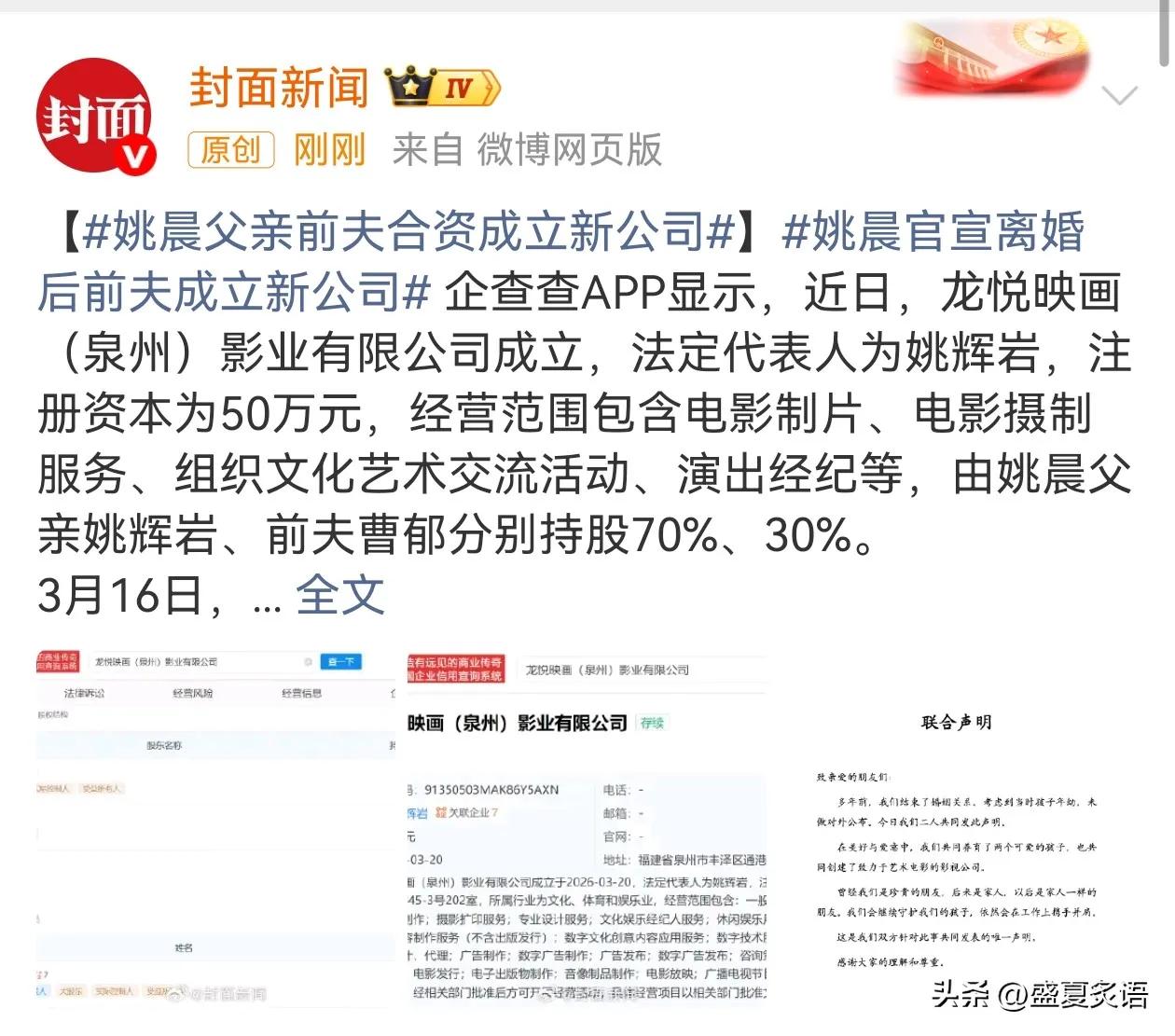 姚晨离婚21天冲上热搜!和前夫合伙开公司,对比汪小菲大S差距太明显 炸了!姚晨离婚才21天,就和前夫曹郁一起冲上热搜,这操作直接看呆全网! 谁都没想到,俩人没传复婚、没抢财产,反倒婚离了,还合伙开起了公司。 企查查最新消息,新成立的龙悦映画影业,法人是姚晨父亲姚辉岩,姚父持股70%,剩下30%的股份,持有人居然是前夫曹郁! 要知道,俩人3月6号才刚官宣离婚,到现在才21天。前脚刚说婚姻结束,后脚前夫就和前岳父联手搞事业,这操作在内娱真的太少见了。 说真的,这俩离婚是真体面。曹郁是业内拿过不少大奖的顶尖摄影师,俩人因戏生情,结婚生了一双儿女,就算离了也没半句互撕,官宣声明客客气气,只说会共同抚养孩子,现在更是直接事业继续搭伙,这格局真的绝了。 而这波操作,和之前闹得全网皆知的汪小菲大S一家,反差直接拉满。 人家离婚是和气合伙搞事业,他俩离婚直接演了好几年狗血连续剧,床垫风波、天价电费、抚养权拉扯,双方家长下场互撕,隔三差五就上热搜。别说合作了,就连见孩子都能闹得人尽皆知,最后两家人闹得老死不相往来,一地鸡毛。 网友评论也直接说透了:“这才是成年人离婚该有的样子,不爱了,孩子一起养,事业还能合作,格局太大了”,还有人调侃“对比汪小菲大S,这俩简直是内娱离婚体面天花板”。 现在内娱明星离婚,好像不撕一场都不算完,为了财产流量互相泼脏水,最后两败俱伤。但其实婚姻走到头,从来不是只有反目成仇一条路,能守住体面好聚好散,才是真的有大智慧。姚晨这波,真的给内娱上了一课。