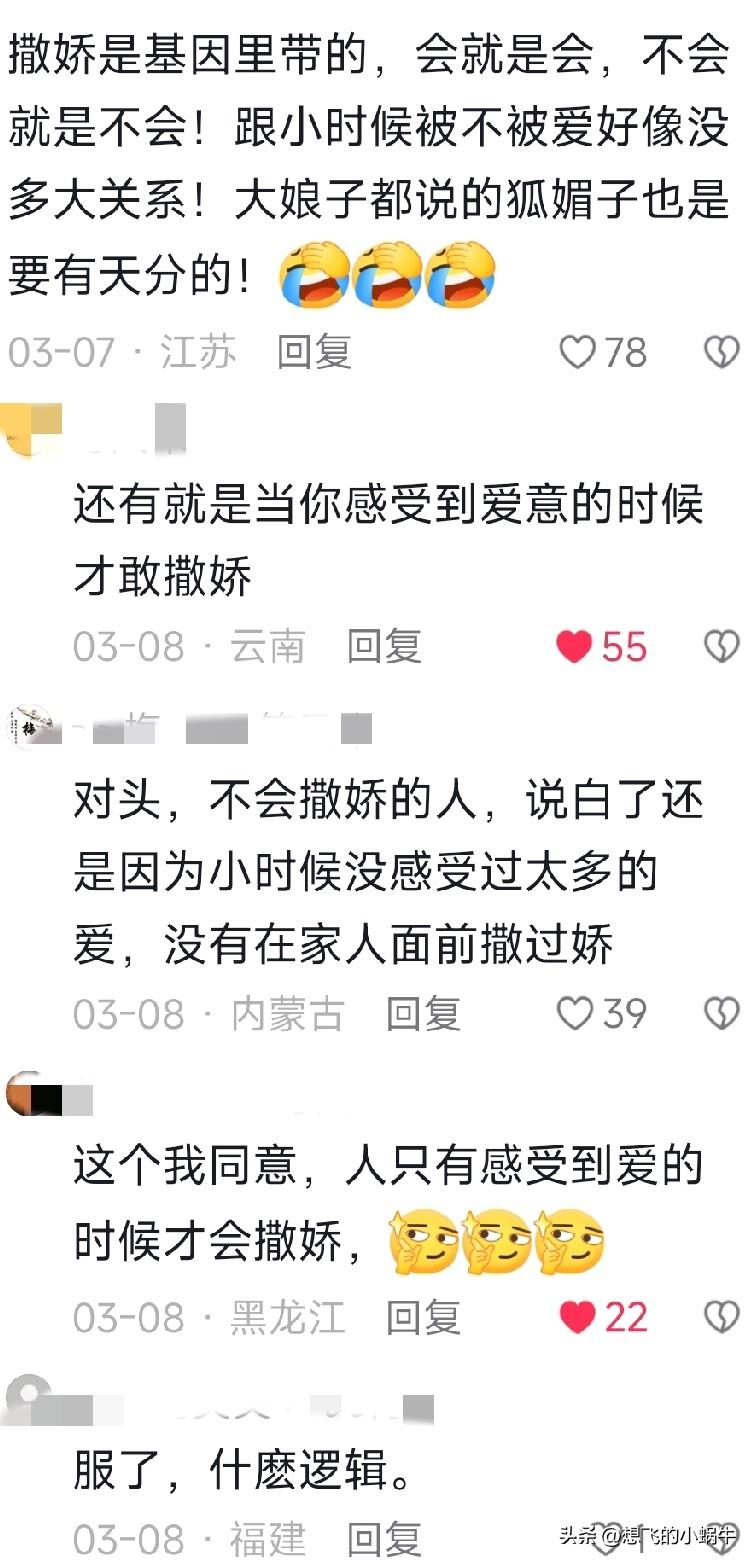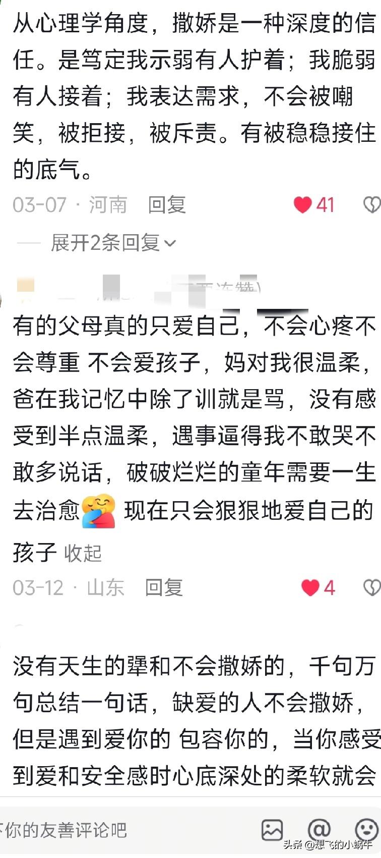 关于给谁撒娇?怎么撒娇这件事我的看法[思考] 讨厌你的人你一说话都会骂你在勾引在犯贱 喜欢你的人你一笑他们都觉得你可爱你真好 所以撒娇这个词 在讨厌你的人眼里就是勾引就是轻浮 在喜欢你的人眼里就是对他们稳稳的信任感与温柔 有些父母天生自私自利,有啥好说的!反正我从来没在他们跟前撒过娇! 倒是经常爬我奶奶怀里轻声细语的说说笑笑! 能给足你安全感与爱的人才能在他们面前撒娇…… 总之,在有些面前你就是钢筋水泥混凝土做的 在有些人面前你才是那肉身凡胎 ……