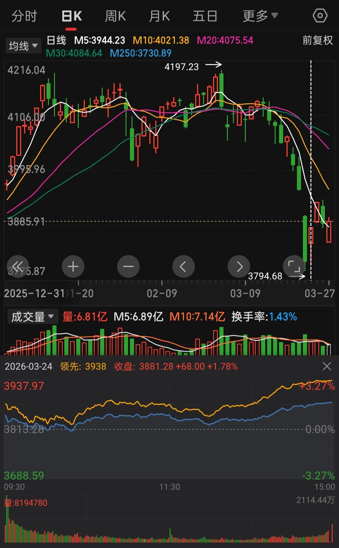 为什么今天股市能够低开高走?来,我告诉你答案。 昨晚美股暴跌,估计许多股友们都被吓住了,再加上A股开盘的低开,你是不是把筹码给交出去了? 其实,以目前的走势来看,我认为A股的多空博弈已经处于一个相对平稳的状态,所以低开这么多反倒成了别人捡低价筹码的机会。 这轮下跌行情主要原因来自于美伊冲突的升级,但最近美伊又释放出谈判的信号,虽然不一定能谈成,起码战斗烈度是有些缓和了,所以信息上的风险相对缓和一些。 而且我们可以看看今天开盘的位置,它不就是在3月24日开盘价的附近吗?3月24日那天高开接近1%,说明反弹资金的实力是比较强的,而且那天还有回踩,相当于把高开的缺口也给补了,这时我们就可以推断,3月24日的开盘价有强支撑作用。 所以,今天开盘虽然低开,但在强支撑作用下又迅速拉高,是这么来的。 以上是我的个人观念,不喜勿喷。