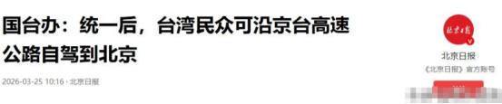 大陆热烈邀请!郑丽文离岛前,台胞收到通知,统一后可自驾来北京 先跟大家说第一个,也是最让台胞振奋的消息。2026年3月25日,国台办开了例行记者会,发言人朱凤莲在会上明确说了,等两岸和平统一后,台湾同胞可以从台湾本岛出发,沿着京台高速公路,自己开车就能到北京来游览。这句话一出来,不管是大陆同胞还是台湾同胞,都特别关注,议论纷纷。 可能有人会问,这真能实现吗?不是随口说说的吧?肯定是真的,这不是空想,是有实实在在规划和基础的。大家可能不知道,京台高速公路早就有规划,起点是北京,终点就是台湾台北,大陆这边的路段,早就全线贯通了,一直修到了福建平潭。 平潭和台湾的新竹隔海相望,最窄的地方也就一百多公里,只要两岸统一,就会修建海峡快速通道,把平潭和台湾的高速连起来,到时候开车就能直接穿过去,不用坐船,也不用转机。 而且大陆的基建能力大家都有目共睹,港珠澳大桥、平潭海峡公铁大桥这些难度极大的工程都能建好,修建台湾海峡的快速通道,技术上完全没问题,早就经过了专家反复论证,只要统一,很快就能开工建设,用不了几年就能通车。 到时候,台湾同胞开着自己的车,从台北、新竹上高速,穿过海峡通道,进入福建平潭,再无缝接入大陆的高速路网,一路向北,就能直达北京,全程也就二十多个小时,分两三天开,轻松又方便,还能沿途看看祖国的大好河山。 朱凤莲发言人还说了,统一后,大陆会帮台湾升级各种基础设施,不只是高速,还有环岛高铁、能源、农林水利这些,都能得到重建和升级,让台湾同胞的生活更便利。 比如现在台湾的环岛铁路,速度慢,还经常出问题,统一后会建成时速350公里的环岛高铁,台北到高雄一个小时就能到,比现在方便太多。这些都不是空话,都是大陆基于自身实力,做的实实在在的规划,目的就是让台湾同胞能享受到更好的生活。 就在这个好消息发布的同时,还有一个关乎两岸当下交流的消息,那就是国民党主席郑丽文,已经敲定了今年4到6月离岛访陆的行程,大陆方面也第一时间发出了热烈又诚挚的邀请,这就是大家说的“当下行程”——一边规划着统一后的美好未来,一边推进着当下的两岸交流。 郑丽文这次访陆,目的很明确,就是坚持“九二共识”、反对“台独”,推动两岸重启交流合作,促成两岸高层会面,缓解台湾岛内的困境。 这些年,因为民进党当局搞“台独”,阻挠两岸交流,台湾的旅游业、农业都受到了很大影响,农民种的凤梨、释迦卖不出去,旅游业者没生意做,基层民众的日子不好过,大家早就盼着两岸能恢复正常交流了。 郑丽文也多次表示,这次访陆没有任何条件,就是为了积累两岸的善意,降低对立,把台湾民众渴望和平、渴望交流的心声带到大陆来,解决实实在在的民生问题。 而大陆方面,一直秉持“两岸一家亲”的理念,始终敞开大门,愿意和包括国民党在内的台湾各政党、团体加强交流,只要坚持一个中国原则,反对“台独”,大陆都会热烈欢迎,这也是大陆发出邀请的初衷。 可能有台胞会疑惑,统一后除了能自驾去北京,还有什么好处?其实好处还有很多。比如统一后,大陆14亿人的大市场会零关税向台湾农户敞开,台湾的农产品再也不用愁销路。 台湾同胞在海外遇到困难,手持中华人民共和国护照,就能得到中国驻外机构的保护,腰杆更硬,更有尊严;台湾的年轻人也能和大陆年轻人一样,在全国范围内读书、就业、创业,享受同等的待遇,不用再被“22K薪资”困住。 大家要明白,大陆这次说的统一后台胞可自驾来北京,还有邀请郑丽文访陆,都不是偶然,也不是做做样子,而是真心实意想推动两岸和平发展,想让两岸同胞都能过上好日子。 两岸本来就是一家人,打断骨头还连着筋,以前因为各种原因,两岸交流受到了阻碍,但现在,不管是未来的规划,还是当下的行动,都在朝着团圆的方向走。 民进党当局一直骗台湾同胞,说统一不好,其实都是为了自己的私利,他们不管台湾同胞的死活,只会搞分裂,只会让台湾陷入危险。而大陆的每一个举措,都是为了台湾同胞的福祉,从统一后的交通便利,到民生改善,每一样都实实在在,看得见、摸得着。 现在,郑丽文即将离岛访陆,大陆的热烈邀请已经发出,统一后的美好蓝图也已经清晰展现。 希望台湾同胞能看清真相,明白只有两岸统一,才能有安稳的生活,才能有更好的未来。等到统一那天,大家开着车,从台湾一路自驾到北京,去天安门看升旗,去逛故宫、吃烤鸭,这一天,相信不会太远。