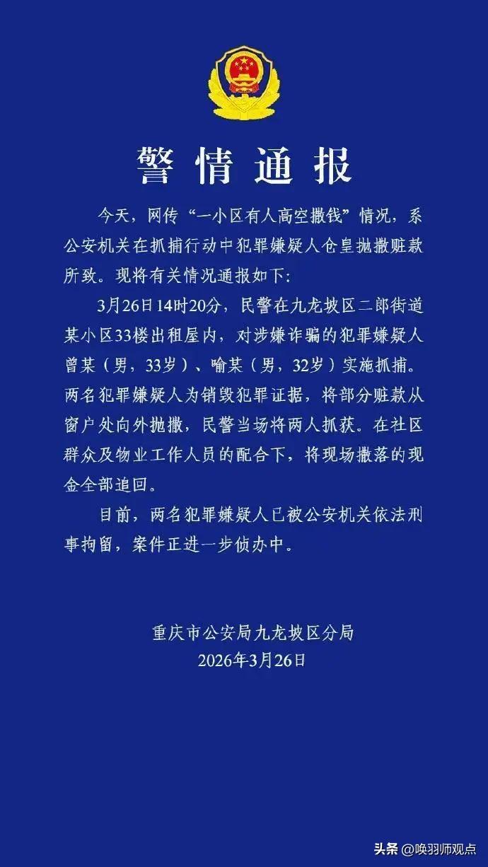 楼上惊现现金雨!我能捡吗? 3月26日下午,重庆九龙坡区某小区33楼,两名涉嫌诈骗的男子曾某、喻某在警方抓捕时,将赃款从窗户抛撒,试图销毁证据。物业和居民迅速配合,将散落的现金全部追回,两名嫌疑人被当场刑拘。 专家指出,诈骗团伙坚持用现金交易,往往针对不擅用智能手机的老年人,目的是切断资金流向的电子痕迹。慌不择路的“撒钱”行为,恰恰暴露了他们对证据链被查实的恐惧。近年来,成都、深圳等地也曾发生类似“烧钱”“藏卡”的末日操作。 警方提醒:捡拾他人撒落的现金拒不归还,属于违法行为。面对意外之财,守住底线才是真智慧。 --- 互动话题: 如果你在路边看到有人撒钱,第一反应是什么?你会选择捡起来上交,还是觉得“谁捡到归谁”?欢迎在评论区聊聊你的看法!别人遗失在地上的钱不能捡是吗 上海丢钱包 街头现金被抢 现金陷阱 失而复得的现金 房东诈骗 现金新骗局 现金事件