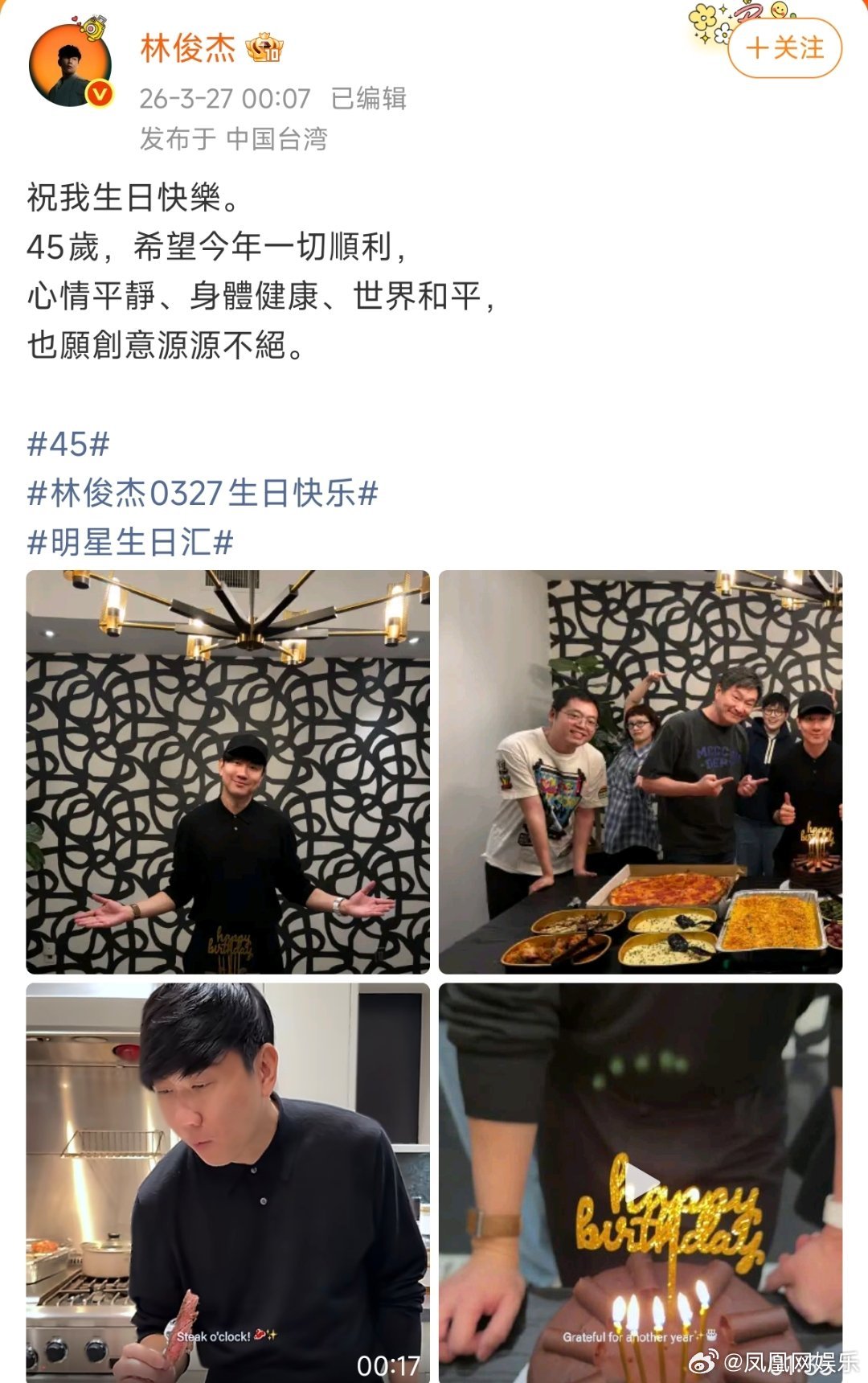 林俊杰晒45岁生日合影七七疑缺席林俊杰生日聚会3月27日凌晨,在社交平台上晒照庆祝自己45岁生日,并配文:“祝我生日快乐。45岁了,希望今年一切顺利,心情平静、身体健康、世界和平,也愿创意源源不断。”网友发现,林俊杰小21岁的网红女友七七并未出现在合照中。