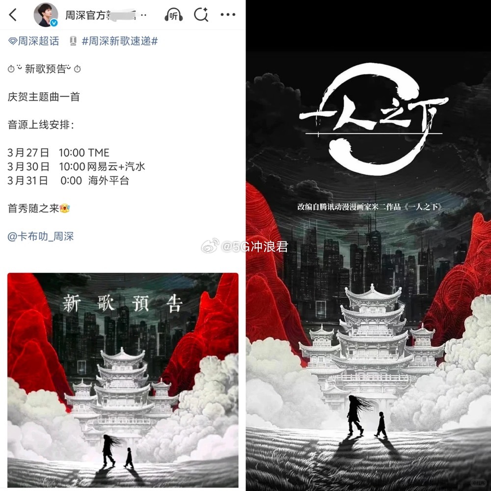 压力给到周深工作室 周深说新歌是你的,工作室说新歌是你的,一人之下官方说轮流来,工作室已经去全民K歌练上了,十点上线今晚还有舞台。
