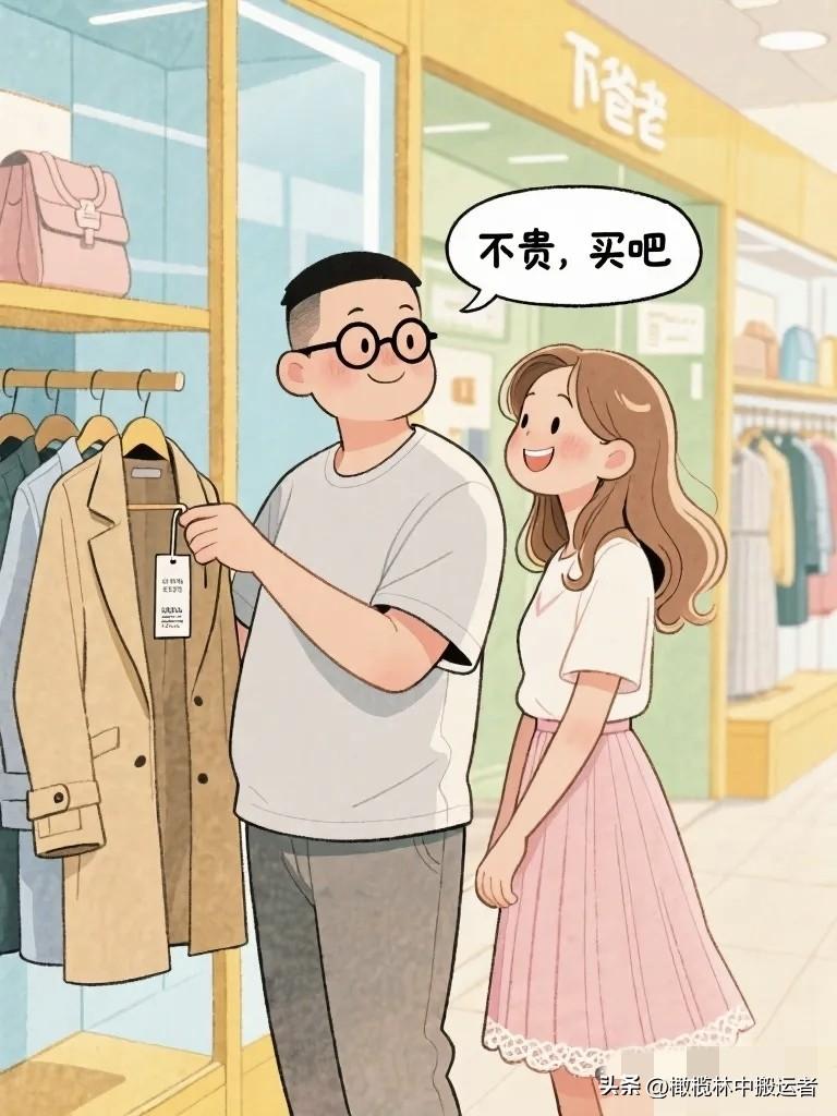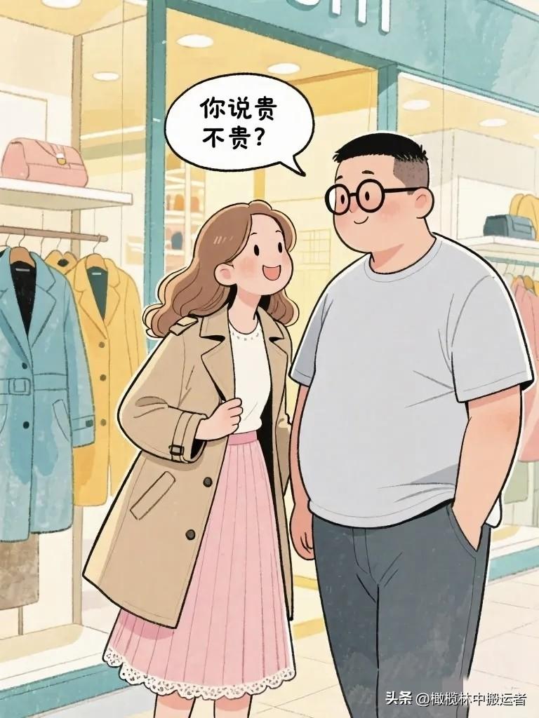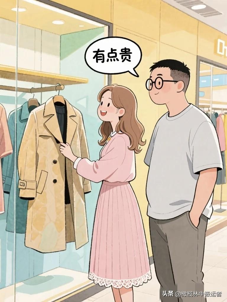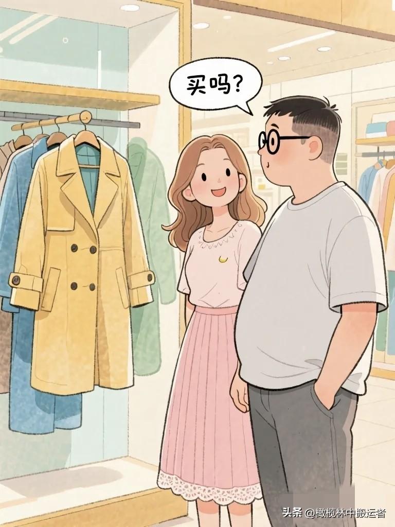 搞笑漫画:老婆拉老公在一件大衣面前站了十分钟。老公询问:“买吗?”老婆:“有点贵。”老公:“喜欢就买。”老婆:“你说贵不贵?”趣味小漫画 夫妻日常漫画