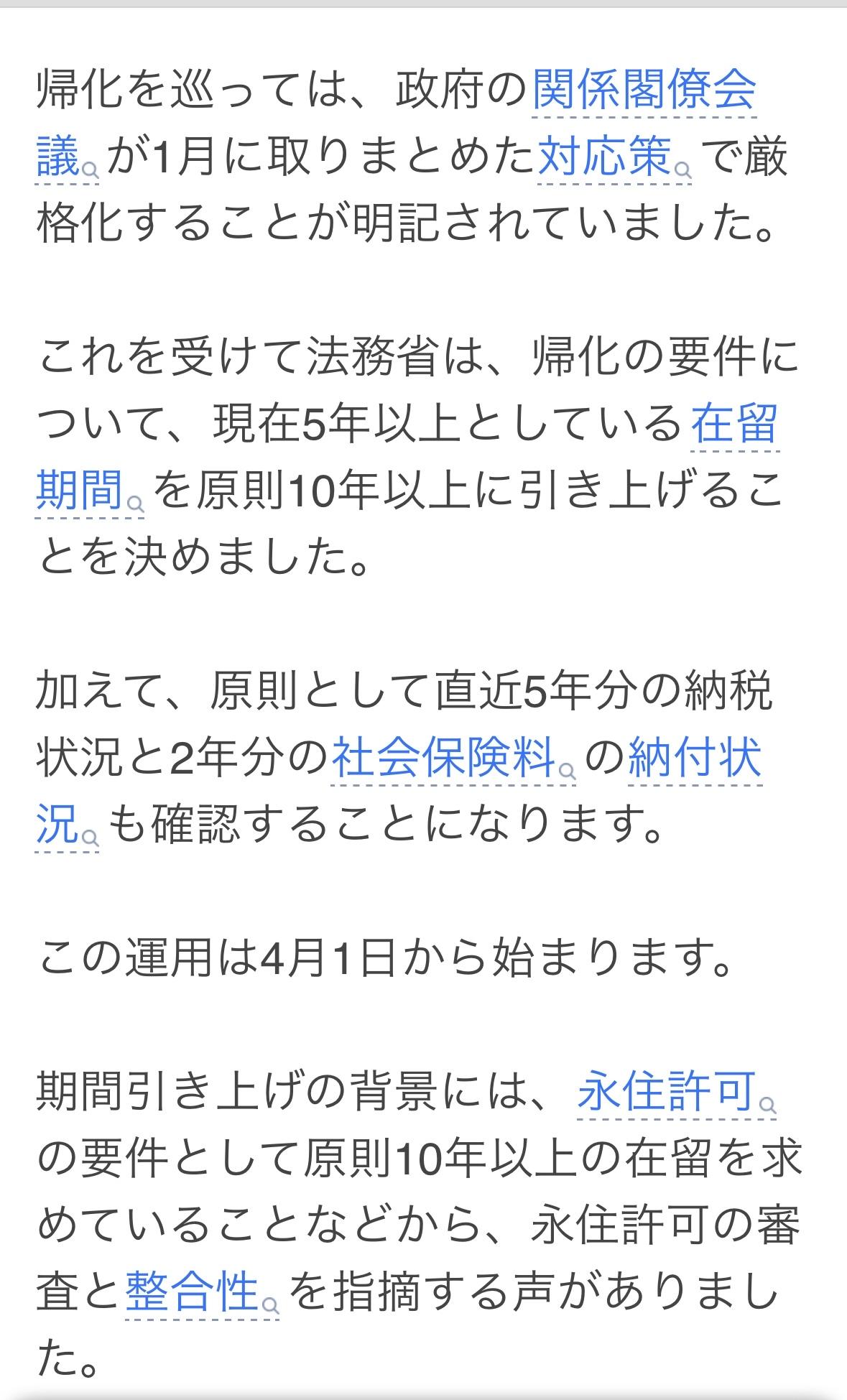 法务省将入日本国籍所需的居住年限原则上从目前的5年提高到10年,此项变更4月1日起生效。 司法部还将核实申请人过去5年的纳税情况和过去2年的社会保险缴费情况。 提高居住年限的原因是,鉴于永久居留权原则上要求10年或以上的居住年限,人们担心这与永久居留权申请流程的兼容性存在问题。