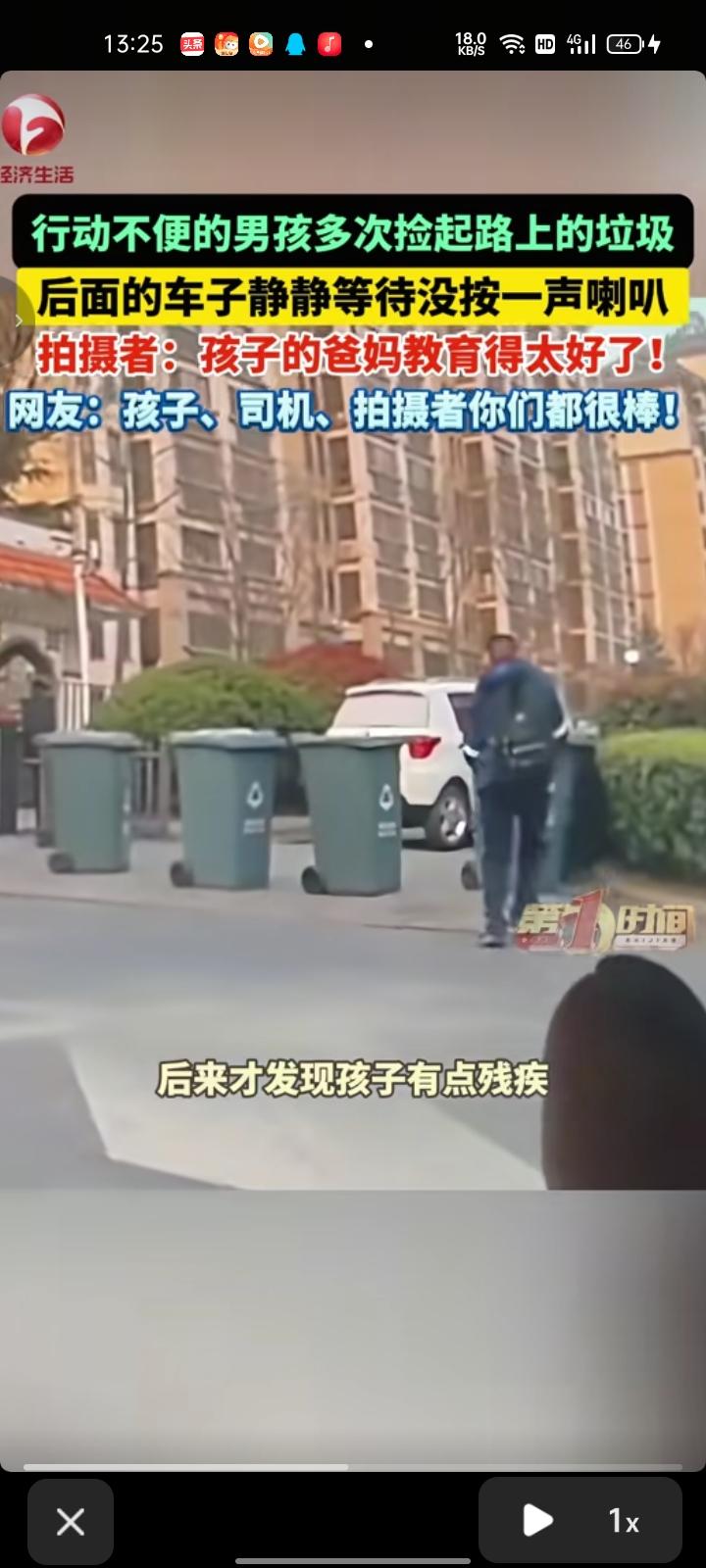 3月23日,山东青岛。宫女士称,她在即墨区一个小区门口看到让她感动的一幕,一位男孩多次捡路上的垃圾,还捡的这么慢,奔驰车在那等待没按喇叭。后来才发现孩子有点残疾,他爸妈教育的太好了,等待的司机也很暖心。