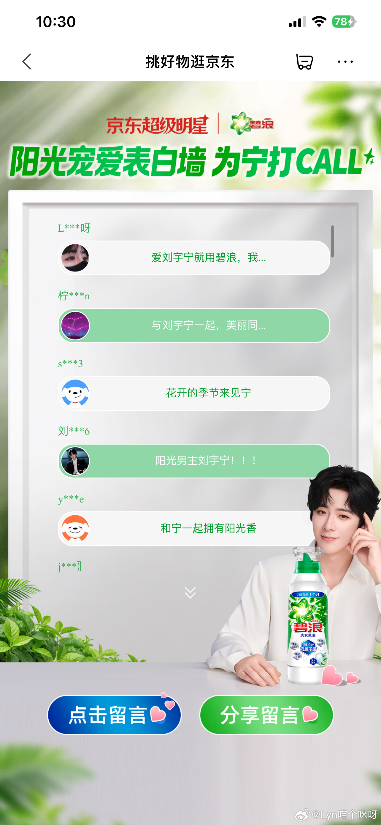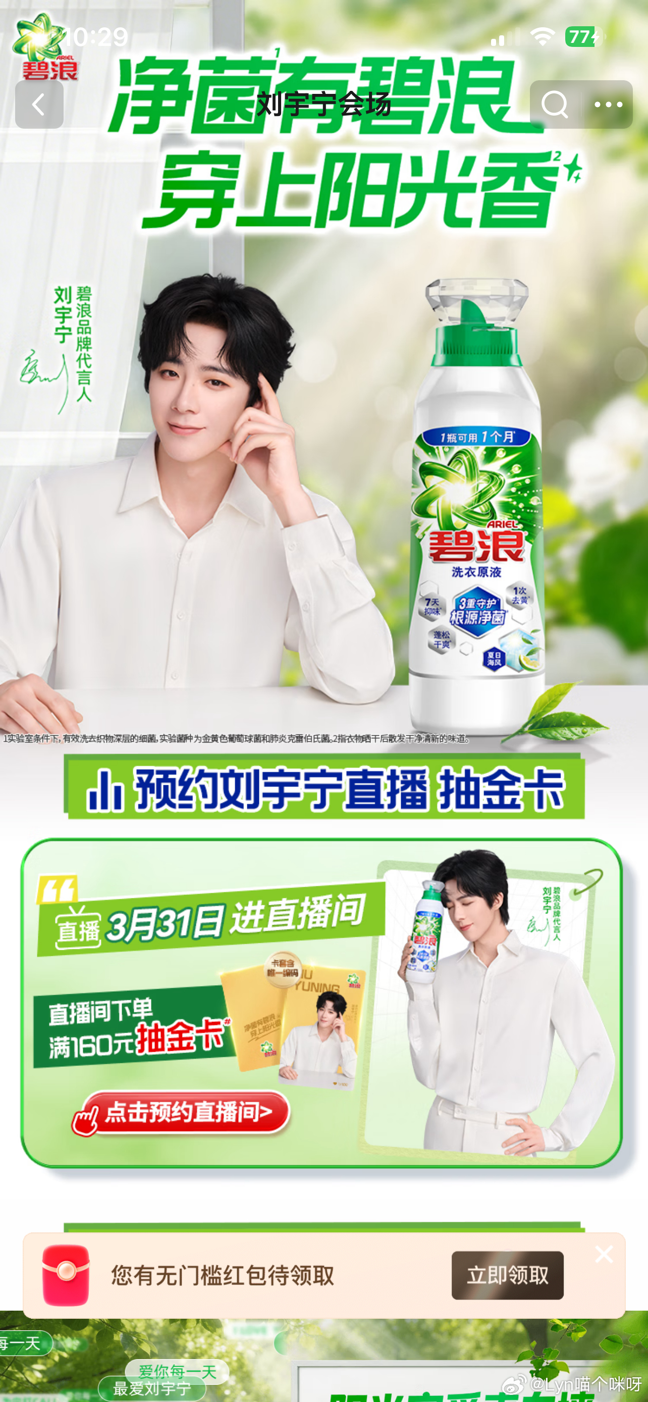今天10:00起上京东 🔍「碧浪原液」预约刘宇宁碧浪品牌代言人 直播一起穿上阳光香,解锁超多宠爱惊喜💕