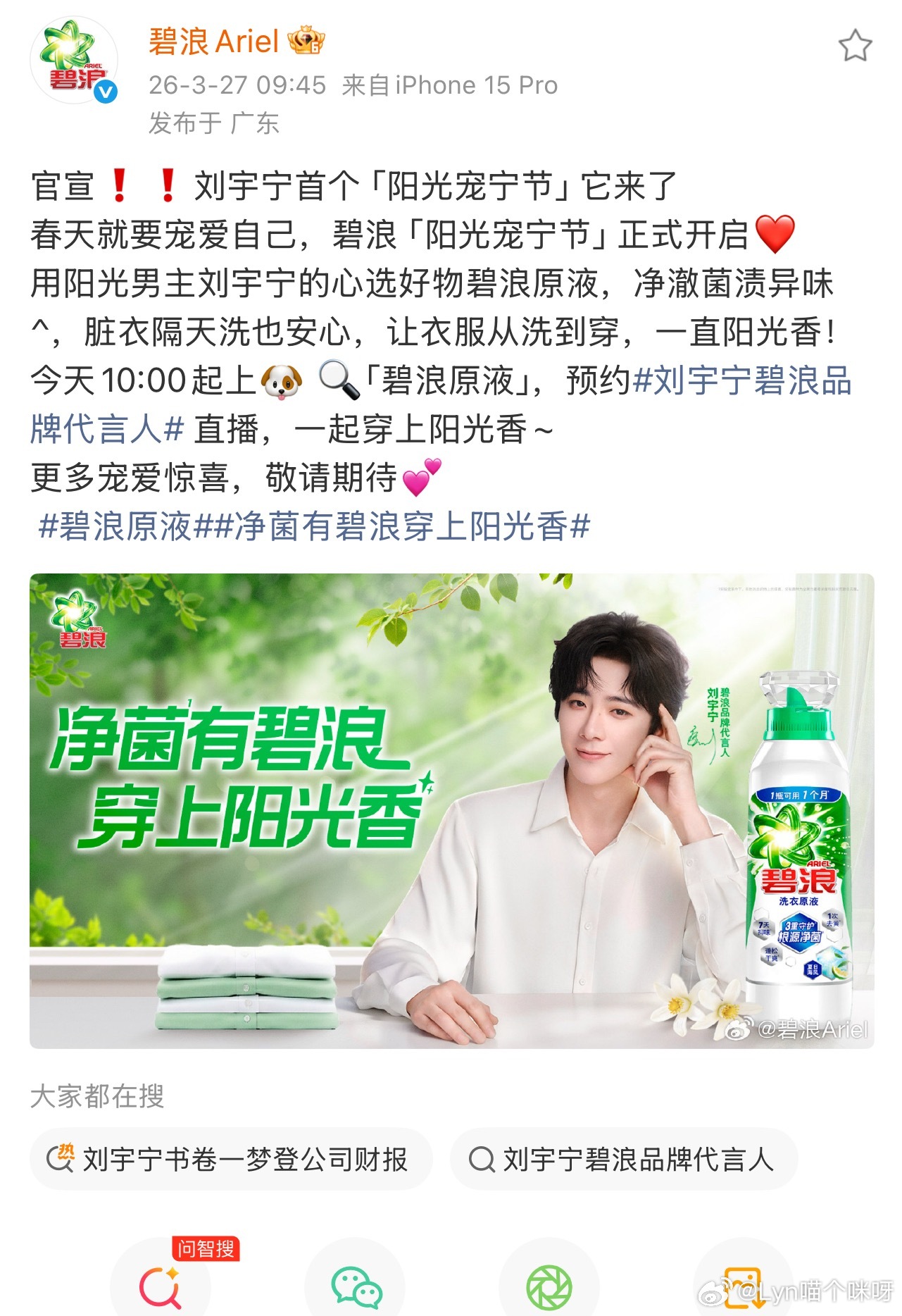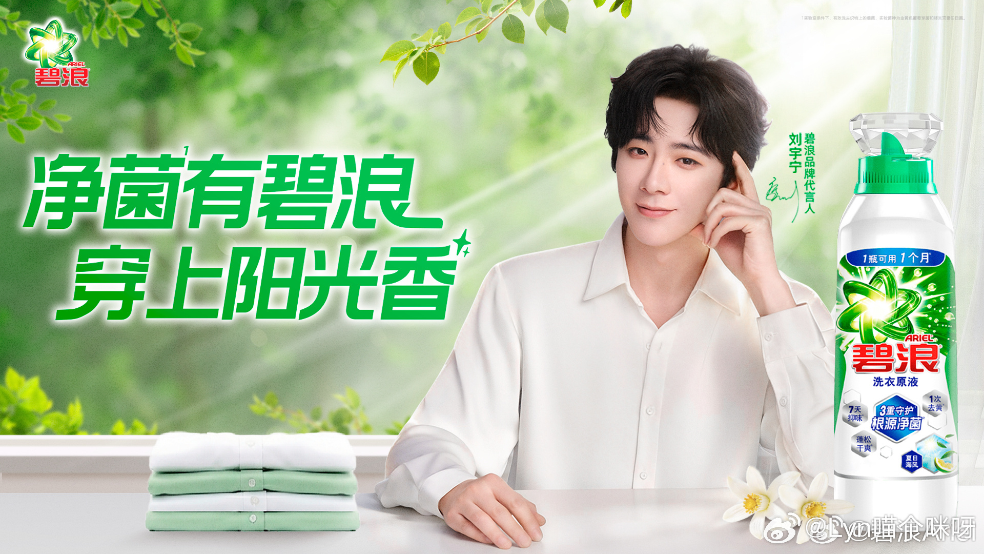 官宣❗❗ 刘宇宁首个「阳光宠宁节」来啦💛春天就要好好宠爱自己,碧浪「阳光宠宁节」正式开启✨阳光男主刘宇宁心选好物——碧浪原液,净澈菌渍异味,脏衣隔天洗也安心,让衣服从洗到穿,满满阳光香!