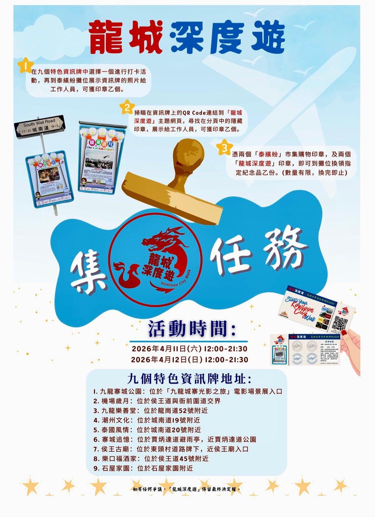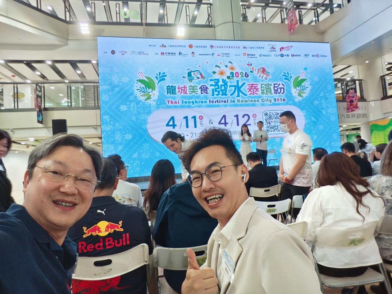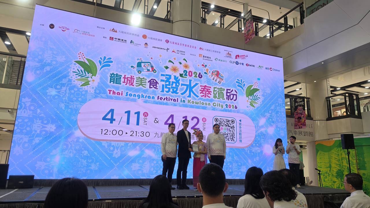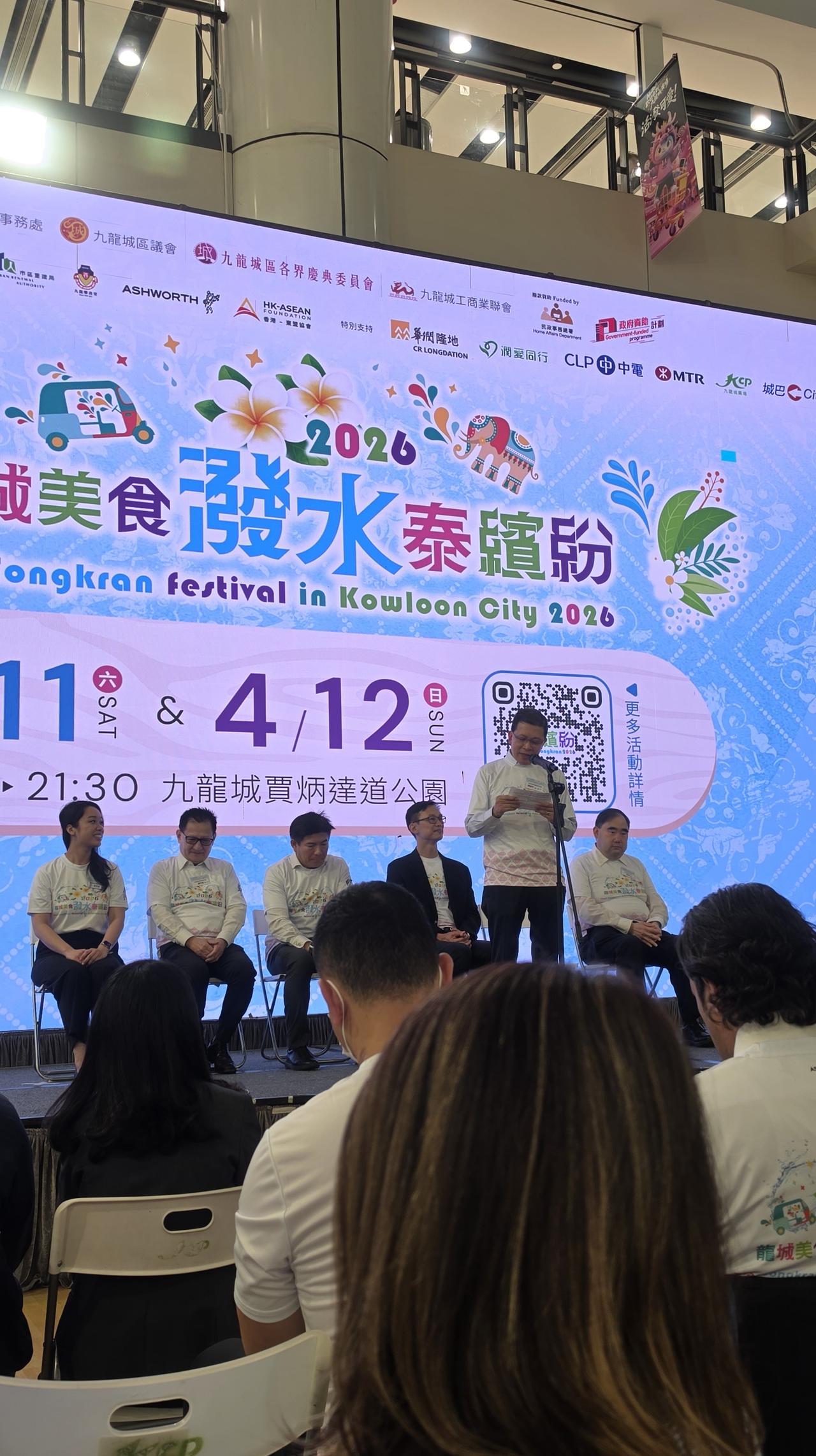 「龙城美食泼水泰缤纷2026」 由九龙城民政事务处、九龙城区议会、九龙城区各界庆典委员会及九龙城工商业联会联合主办「龙城美食泼水泰缤纷2026」,今天举行发布会,九龙城民政事务专员蒋志豪及泰国驻香港总领事Mr Chaturont Chaiyakam及九龙城各界人士代表等出席,并预告今年泰缤纷活动丰富多彩,致力向大众推广九龙城区独有的泰国文化特色,促进社区共融,提振区内经济。届时将推出泰国特色市集、泼水体验、泰拳表演赛等活动,更新增「消费优惠双重赏」,为市民及游客提供购物优惠。 活动将于4月11日至12日假九龙城贾炳达道公园足球场举行,泰缤纷特色市集将在活动期间提供多种地道泰式美食及泰国特色商品,让到访者感受正宗泰式风味;泰拳比赛及文化表演将接连呈现视觉盛宴;市民及游客更可于活动网页报名参与泼水体验,感受泰国传统祝福仪式带来的欢乐气氛。 另外活动也将在2026年4月推出一系列特色活动,提供多元化的文化体验及购物乐趣,让全港市民及游客在九龙城区,感受泰式风情,享受美食、购物及娱乐体验。 指定商户消费优惠: 为吸引到访者进一步探索九龙城,今年泰缤纷还新增「消费优惠双重赏」活动,3月27日至4月12日期间,市民和旅客于指定商户单笔消费满200港元,即可获赠10港元现金券,可于4月11及12日泰缤纷泰国特色市集内使用。 联乘「龙城深度游」: 此外,泰缤纷亦将联乘「龙城深度游」于4月11日至12日市集内举行「线上导览 线下集章」活动,市民和旅客完成指定购物和打卡任务便可获得盖章,集齐4个印章即可换领《九龙城寨之围城》电影精美纪念品乙份。 龙城美食泼水泰缤纷: 2026年4月11至12日期间,活动涵盖泰国特色市集、泼水体验、泰拳邀请赛、泰国歌舞表演、泰国服饰体验,场内更设有特色打卡装置。高sir将会和多位KOL落场支持,呼吁大家立即登记参加泼水体验,同亲友一齐感受泰国新年的热闹气氛!