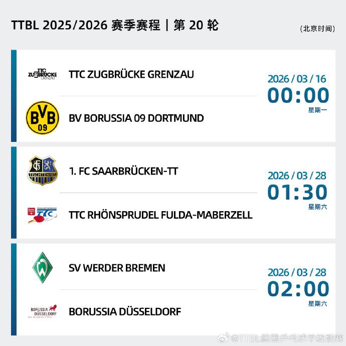 盼了许久, 樊振东终于要重返赛场了! 全网乒迷期待已久的消息,终于有了确切答案。 TTBL德国乒乓球甲级联赛最新更新,信息量拉满。 不仅公布了第20轮的比赛预告,还有第19轮赛后的积分排名。 最让人激动的是,樊振东确定登场参赛! 北京时间3月28日凌晨1点30分, 萨尔布吕肯对阵富尔达。 这也是樊振东休整后,再度站上德甲赛场。 要知道他本赛季在萨尔布吕肯表现超稳,胜率直逼90%。 而且这也是他离开萨尔布吕肯前, 为数不多的主场比赛。 目前萨尔布吕肯稳居联赛前列,这场比赛至关重要。 对手富尔达虽然排名靠后,但也绝非弱旅。 相信樊振东已经做好了充分准备, 状态拉满待出战。 毕竟他近期训练强度拉满, 各项体能指标都达到最佳。 北京时间3月28日凌晨1点30分,锁定这场精彩对决。 期待东哥挥拍出征,延续强势表现,拿下胜利✨ 一起锁定赛事时间,为樊振东加油,为中国乒乓喝彩! 愿他不负努力, 在赛场上发挥出自己的最佳水平,再创佳绩🚩