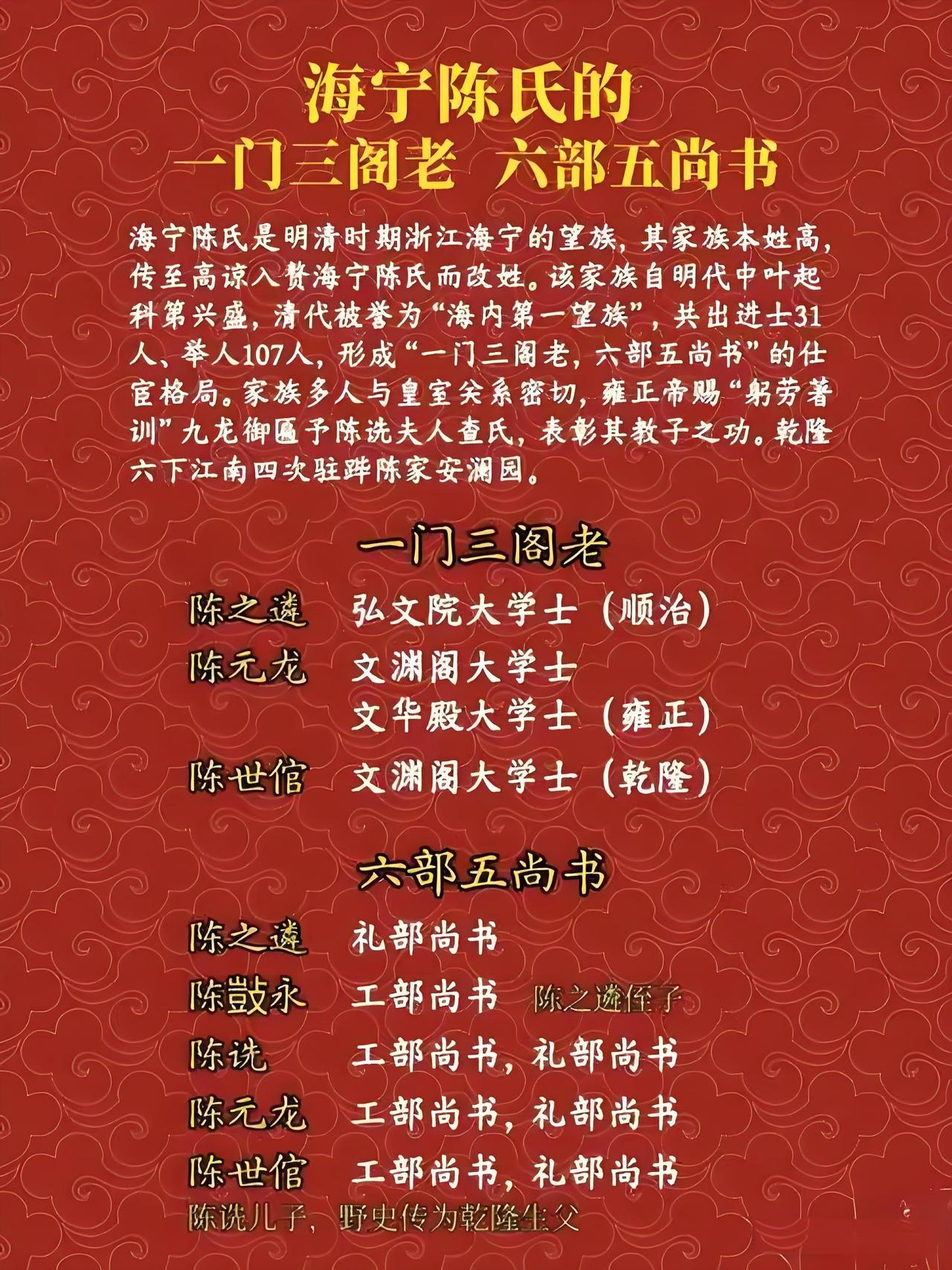 看到网上在聊海宁陈氏,及相关的丹麦海宁如何有权势,说的就像演义小说的性质。其实,现实世界,真正在全球影响力最大的还是来自许昌的颍川陈氏家族。在全球家族排行榜上绝对位列前三。不仅文化底蕴深厚(如政治上在中国开创九品中正制),人口基数也非常庞大,5000万+的人口,远超成吉思汗后人数量。人口规模同样远胜孔氏家族,只是在中国文化塑造上,略逊孔家。 相较之下,海宁陈氏虽说出过“一门三阁老,六部五尚书”,那也只是明清时期的地方显宦。况且他祖上本不姓陈,是北宋高琼之后,入赘到海宁陈明谊家改姓陈,自称“渤海陈氏”。 与颍川陈氏相比,海宁陈氏只是一个演绎色彩的网络奇谈。