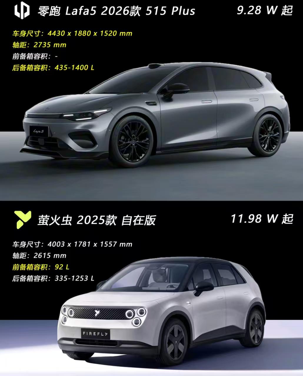 最近在挑稍微精致些的代步小车,看中了萤火虫和零跑Lafa5,两台车都试驾了好几圈,从通勤实用性、配置、续航全方位对比后,最后果断定了Lafa5,毕竟体验差距太明显。 萤火虫胜在车身小巧,好停车,但短板也很突出。续航只有420km,冬季开空调续航缩水更明显,市区代步续航焦虑没彻底解决。空间也偏紧凑,后排坐人有点局促,后备箱储物能力一般。配置方面偏精简,没有智能大屏和高阶车机,只能满足基础代步需求,想要舒适和智能体验基本没有,性价比不算高。 零跑Lafa5完全是为打工人代步量身定做,续航515km日常通勤+周末短途出行都够用,两周一充省时省力。空间更宽敞,后排和后备箱都能满足日常家用,带点行李、买完菜都能轻松放下。配置直接拉满,8155芯片车机流畅不卡顿,语音控制超方便,全景影像、自动空调全标配,内饰质感也远超同价位。 代步车不用追求虚的品牌,实用好开、省钱省心才是王道,Lafa5花小钱享高配,比萤火虫值太多【来自懂车帝车友圈】