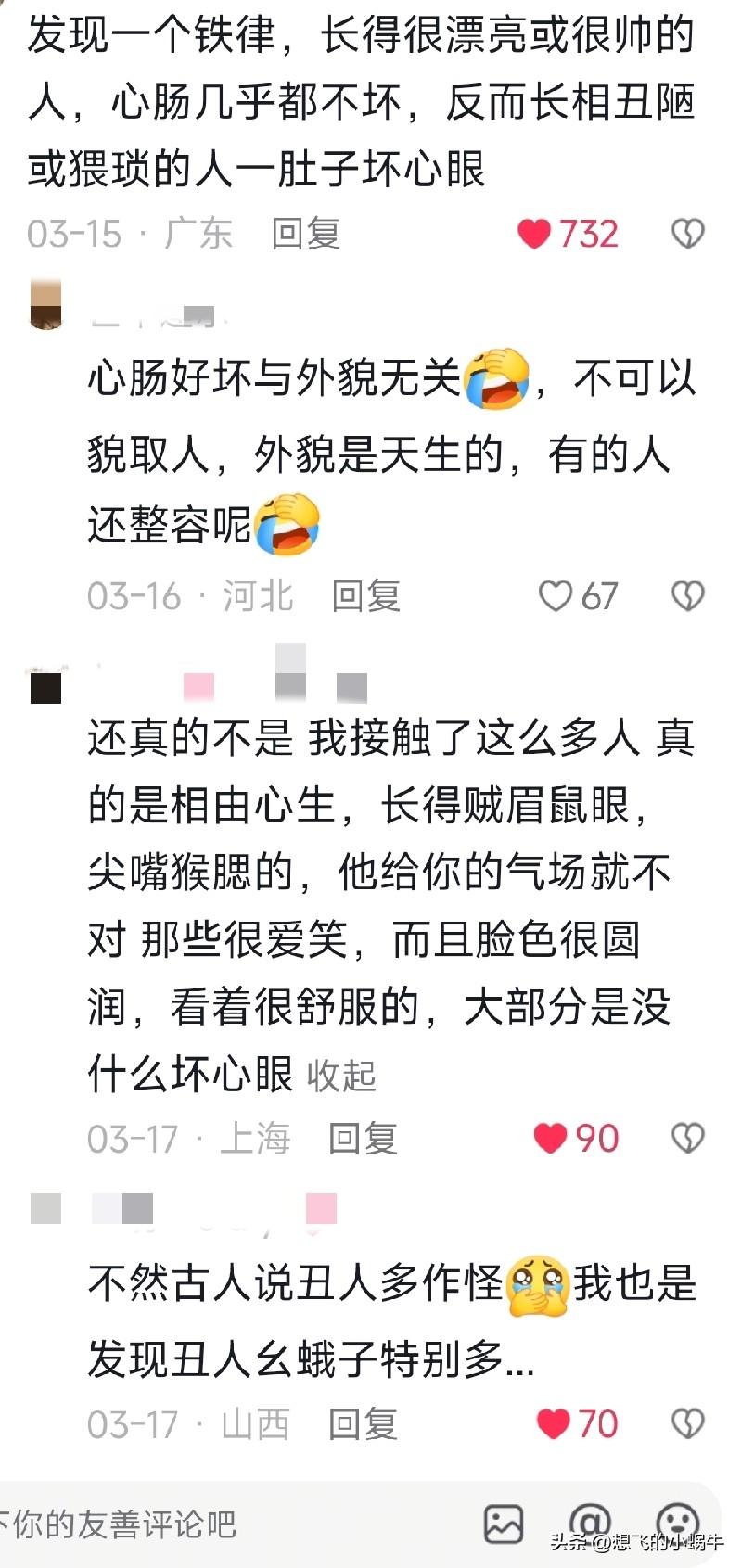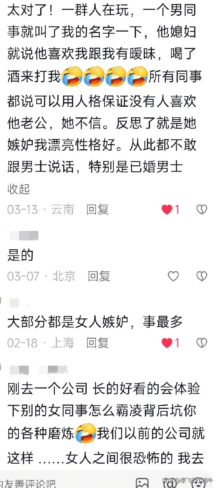 评论区真相了……确实是丑人多作怪心术不正的多!反而长的好看的大多数都心地善良 我从来不认为我长的好看,因为皮肤不好,感觉很丑很自卑…… 但我一直被人排挤,我心想,我这么好的一个人,对任何人都没有伤害她给她使坏之心,还处处为别人着想,从来不说人家重话,她们欺负我,我也总是退一步海阔天空!为啥对我敌意那么大??? 直到老公带我来昆山,我找工作,有个人说了句话我才发现,哦,原来我不丑啊!只是没人家漂亮而已!这也能成为别人讨厌我的理由??? 在一家蛋糕店应聘,一个女的面试我的,她也是新转过来这个店的,因为这个店快撑不下去了,她能力比较强,就把她转过来了,她来的时候还带来个高高胖胖的男孩子一起!她跟我说的,那女的挺高也挺好看的,她说,本来不缺人了,唉,这店也不景气,但是看你形象挺好,说话也轻声细语的,可以当个门面,来个人你就帮忙拿个盘子给人家推荐推荐说不定这店就活了呢[捂脸],那时候确实很瘦,走路也没驼背挺精神的!我就觉得很奇怪,我说你太抬举我了,我这么矮我觉得我挺丑的,她说怎么可能?他们笑了!后来她带我去二楼看了做蛋糕面包的师傅们,让我了解一些东西! 我跟着她去了,一进去那些人都看着我,说又来新人了啊!然后她就说是啊!她把我交给一个女的面包师傅带,让她教教我这那是怎么做的?到时候介绍的时候怎么说! 然而,那个女丑面包师傅恶狠狠的瞪着我,问我你以前干过吗?我说干过,兰州爱的礼物蛋糕店干过,她就说没听过,小店吧!我说是连锁店,她就一脸不可思议,就是很看不起人的那种!我心想我大不了不干了,万一倒闭了发不出来工资我不是白干了!我也没在乎! 旁边一个年轻的台湾男面包师傅说,你别把人家又说的不干了啊!我就心想,原来这里也吃人啊!哈哈!他又说不管人家有没有工作经验,人家走到哪里肯定是要从新学起来的!你只管给她讲我们这里的产品就行了!问那么多干嘛?她就是势利眼小人,感觉怕那个人,赶紧笑笑恭维道,好的,你都发话了我哪敢不好好教啊!阴阳怪气的!!! 她在哪跟弱智似的讲了几个品,说,带我下去店里现场讲,要不然影响其他人工作,我们就下楼了! 带我一下来,立马端起来了,因为店长也是新来的,呵呵,狗东西!然后她就给我跟另一个男孩子讲了几下,台湾男下来看,正好有客人来买面包,店长非要我跟着后面给人介绍!人家客人肯定不喜欢被跟着! 客人走了,然后那男的就说,你们这样是不行的,谁买东西希望后面跟着个人啊?搞得自己跟小偷一样……说完那帅哥就上去了! 店长一脸无奈,说我只是想把销售额提上去大家都不用失业了!我本来在那边待好好的,非要把我调这个破店,别人干死了让我来救,还个个对我不满意…… 我一听都头大了,我心想再待下去,我也是个炮灰啊!毕竟店长让我留下的!我就说几句好话安慰她一下!!!干了一会,店长问我咋样?还可以不?我说还行吧!她说那行,今天也不太忙,你可以早点回去收拾一下办个健康证,明天能来上班吗?我说可以!她让我走了 一出门,我都想赶紧跑赶紧逃离这!事情真多,一个丑女的不给好脸色,一个湾男,一个满怀抱怨的店长!我到最后肯定是夹心饼干!!!我赶紧走走走!!! 后面看到那店都绕道,结果没出两个月,真关门了[呲牙]