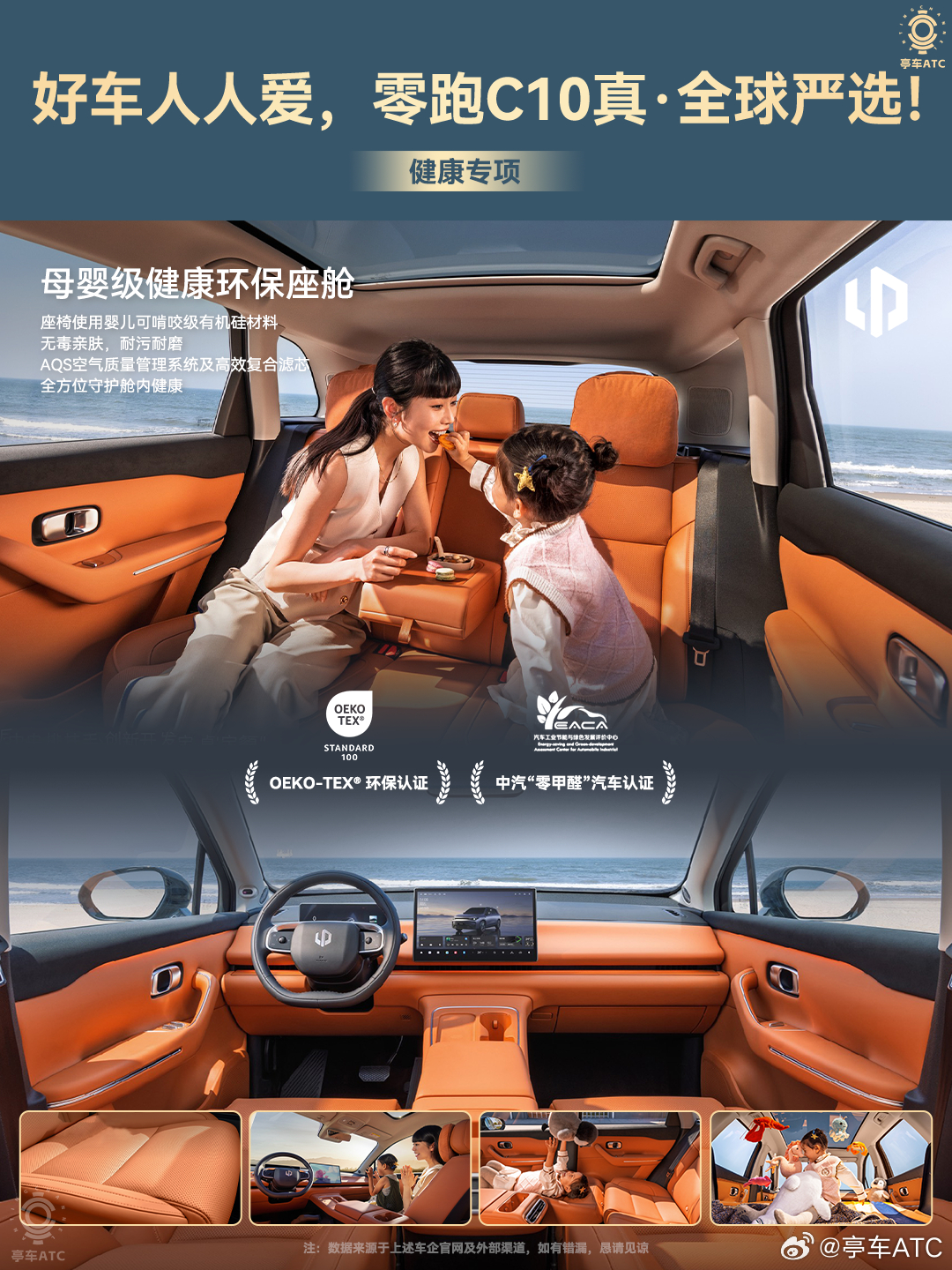 针对带娃家庭,C10也把座舱健康这事,做到了极致,大家买新车,很怕内饰一股味儿,尤其怕有害物质伤着孩子,C10则直接把座舱做成了正儿八经的母婴级,座椅用的是婴儿能啃的有机硅材料,和宝宝奶嘴是同个级别的材质,还拿了OEKO-TEX®环保认证和中汽研的零甲醛认证,等于直接把一间合格的母婴室搬进了车里,孩子在车里随便摸、随便啃,当爸妈的都不用悬着心。