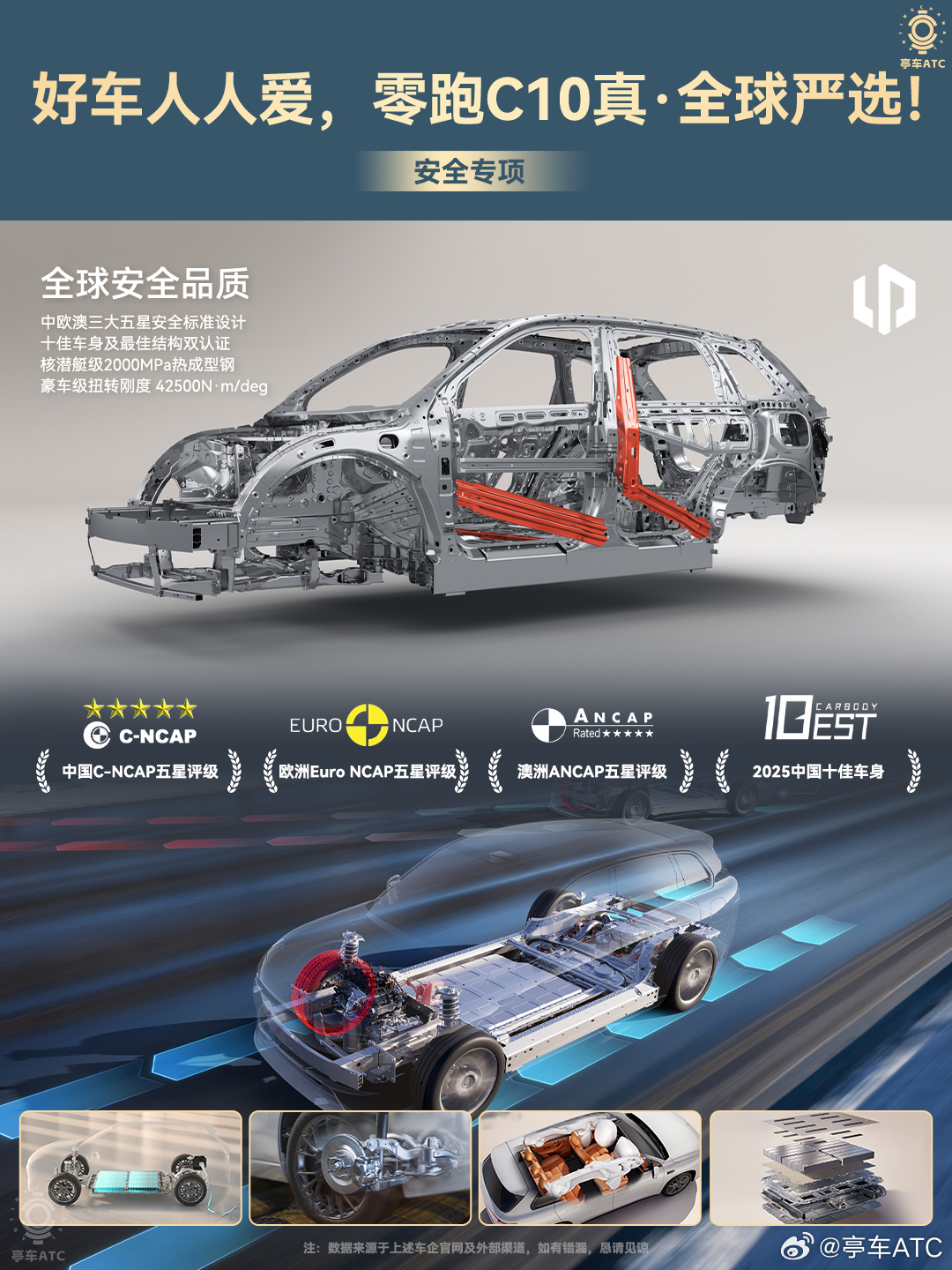 对一台要拉着全家跑的家用SUV来说,刻在骨子里的安全,是半分都不能让的底线。零跑C10的技术底气,就是在中、欧、澳三地严苛的安全碰撞测试中,全拿了五星满分。车身用的是2000MPa的核潜艇级热成型钢,还有豪车级的车身扭转刚度,给全家搭了个移动的“金钟罩”,不管是市区通勤的小剐小蹭,还是高速上的突发状况,都能给你踏实的底气。