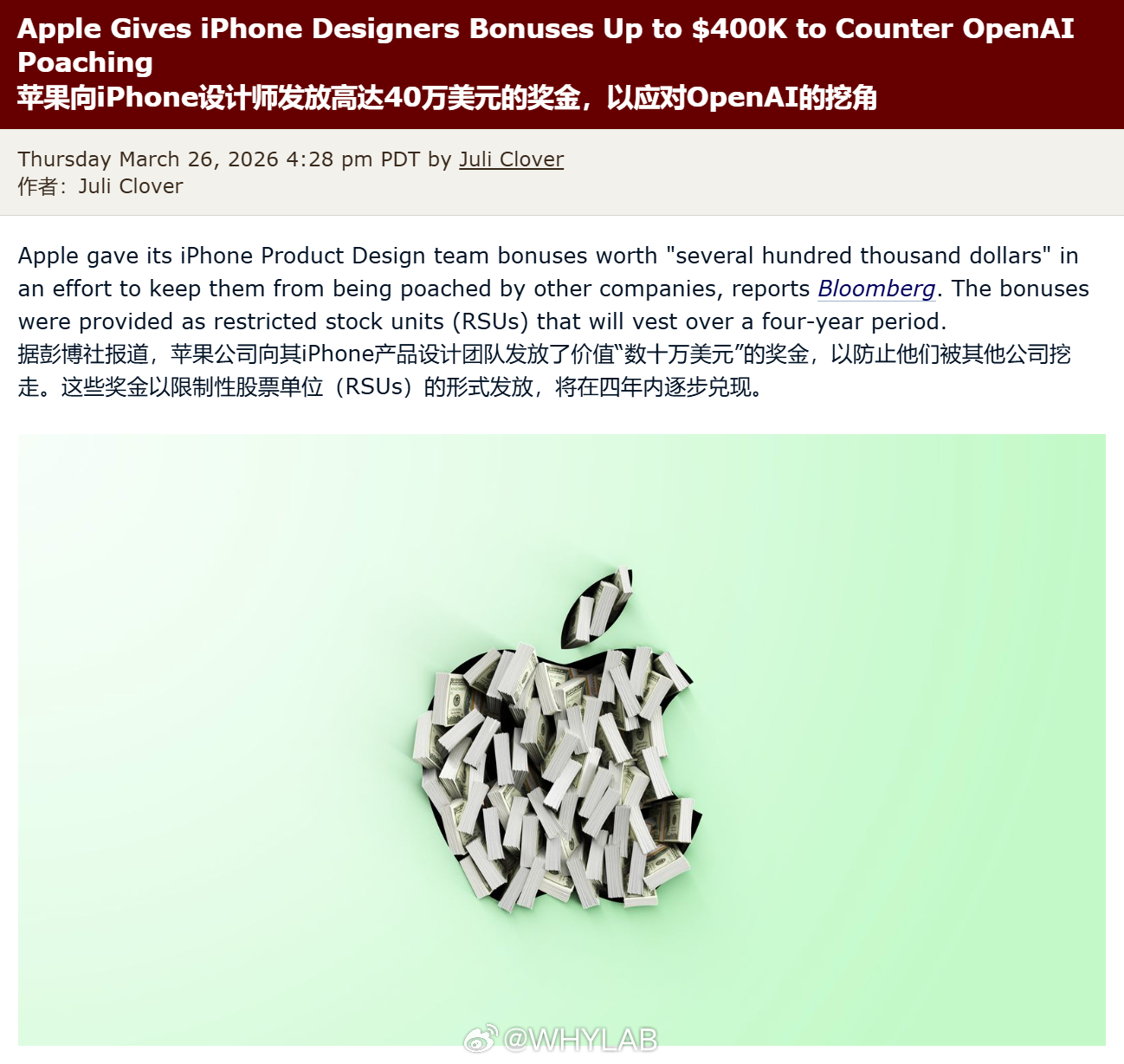 为了应对 OpenAI 还有其他 AI 巨头挖人,苹果向 iPhone 产品设计团队发放价值“数十万美元”的奖金,重金留人。