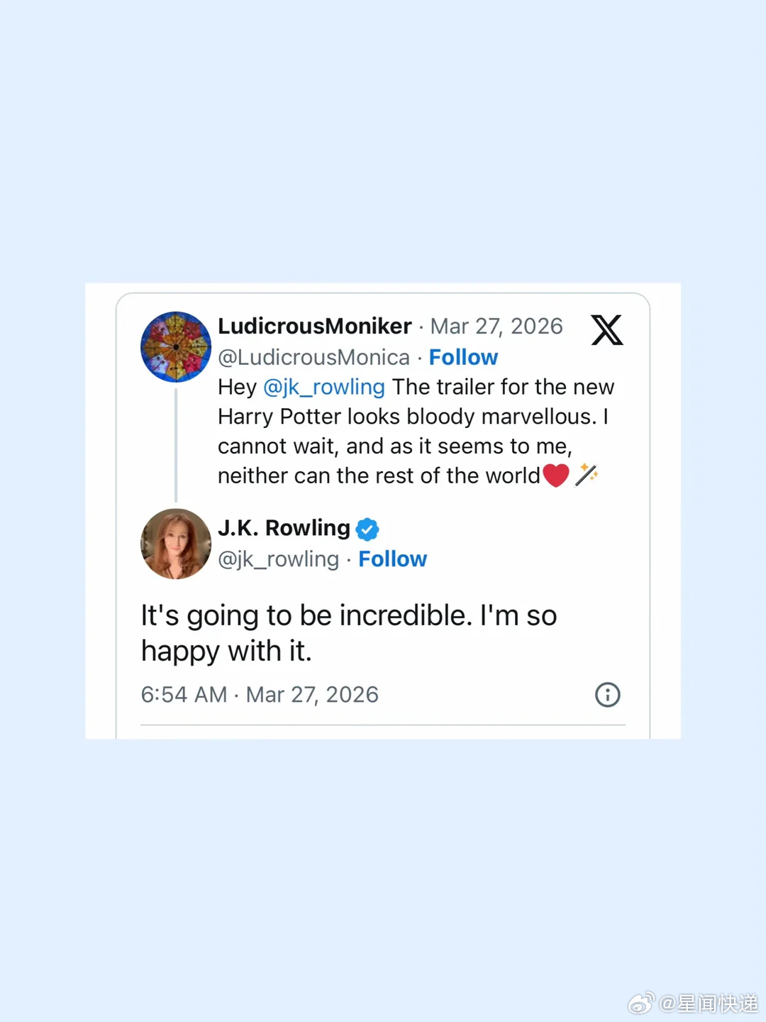 另一边她也对HBO剧版《哈利·波特》给出好评,直言剧集将会非常精彩,自己对此十分满意。jk罗琳对剧版哈利波特非常满意