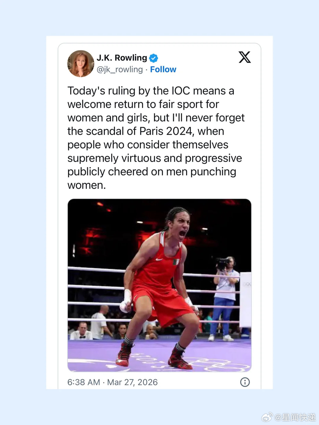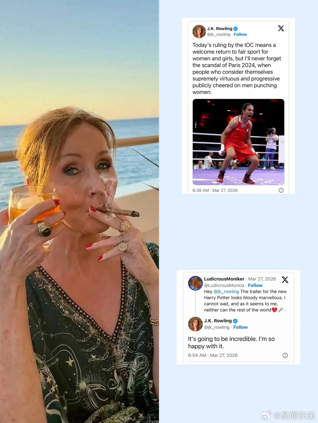 JK罗琳对剧版哈利波特非常满意《哈利·波特》作者J.K.罗琳发文表示,国际奥委会的裁决让女子体育终于回归公平竞技,同时她也直言不会忘记2024巴黎奥运会的争议,直指当时不少人默许男性选手参与女子项目、与女性同场竞技的不公现象。