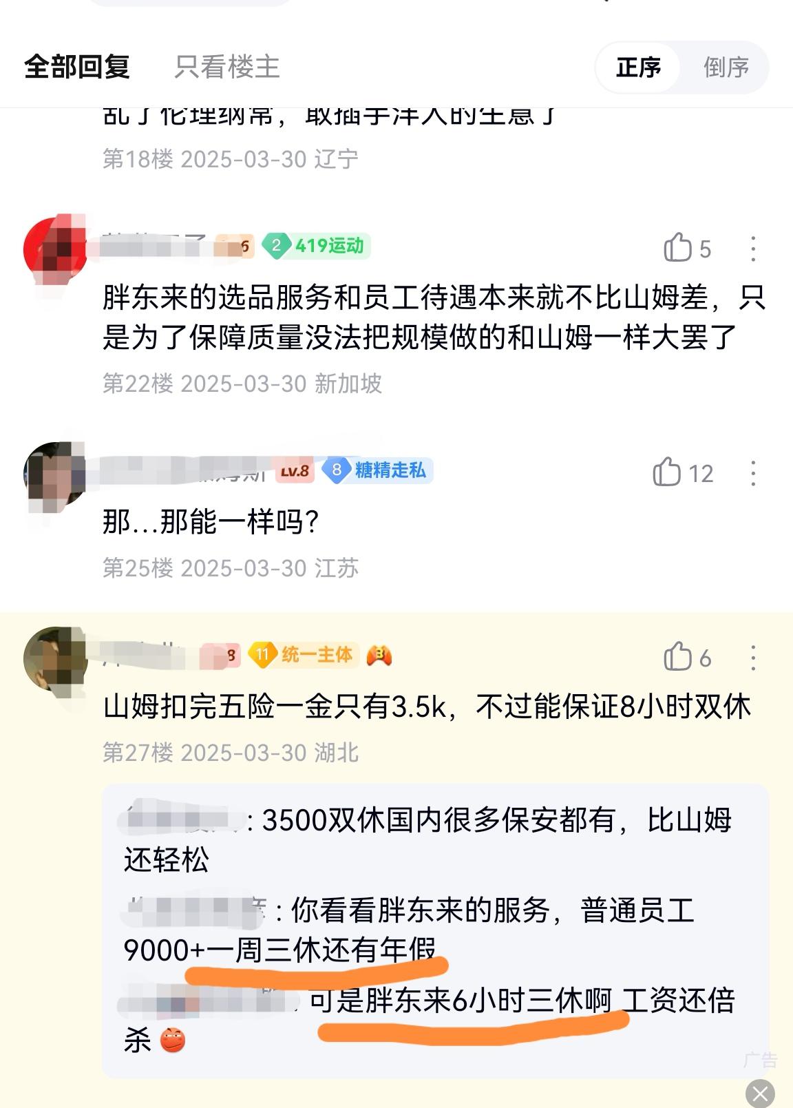 原来这么多网友不知道山姆超市的员工一周双休,而却知道胖东来超市员工有150天假期,认为胖东来员工假期比山姆还多。 相信很多人并不知道山姆超市的员工是一周休两天假,这样算下来,光双休的假期一年都有104天了,不过人家山姆却很少宣传,这也是大家不知道的原因。 胖东来员工的假期想必大部分网友都听说过,因为已经上过好几次热搜了,不过很多人却并不知道胖东来员工一周其实是单休。 胖东来对外宣传自己员工假期是一年140-150天假期,每天上班6-7小时,一周上班是40-42小时,许多网友看到这么多的假期,这么短的上班时间,都以为胖东来员工一周双休,或者三休。 然而胖东来真实假期却只有87天,所谓的140-150天假期,用每天7小时,按照法定节假日的5天8小时,一天多出来1小时,一周就多了6小时,用这6小时折算成了1天假期。 许多网友也是被胖东来宣传的假期搞蒙了,什么一天上6-7小时班,一周40-42小时,年假30-40天,一年140-150天假期,于是都认为胖东来是双休或者三休,当然这或许也是刻意带大家往双休上引,因为都是各种区间,而不是具体的天数。 不过你通过胖东来一周上42小时,一天7小时班就可以知道胖东来是单休,可别再说什么单休外还有个轮休了,如果真有个轮休,一周就应该是35小时,而不是42小时。