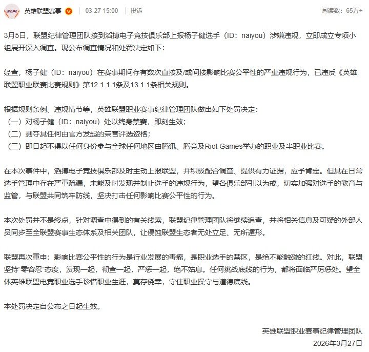 重磅重罚!LOL官方正式下达Naiyou的处罚公告,将终身禁赛+全球禁赛且不得再参加LOL赛事,与此同时TES俱乐部也宣布与 Naiyou解约,永不录用,并扣除其所有赛事奖金!