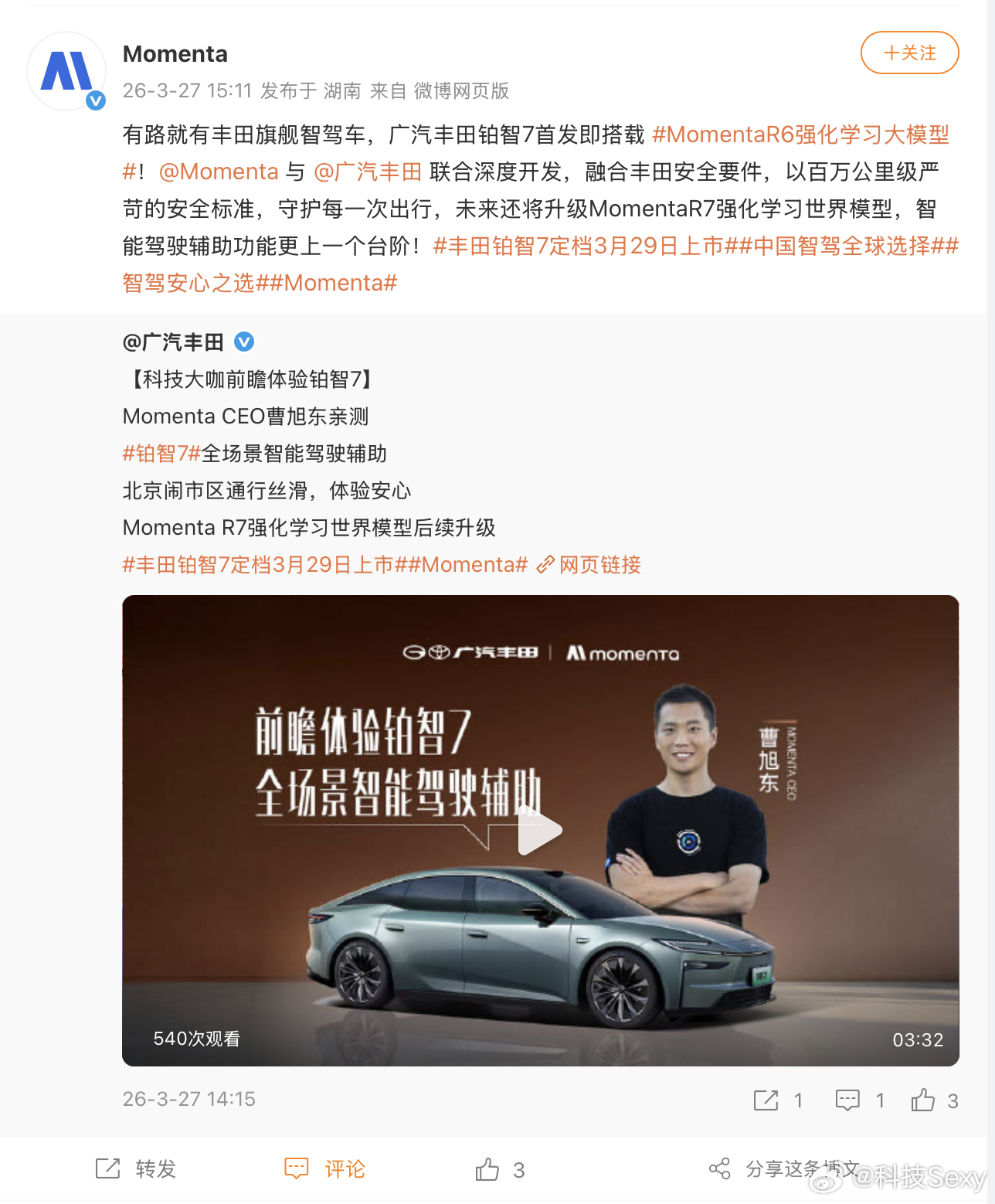 期待一下!3月29日铂智7的正式上市交付。曹旭东说丰田铂智7将上R7大模型铂智7发布前科技大咖先验货
