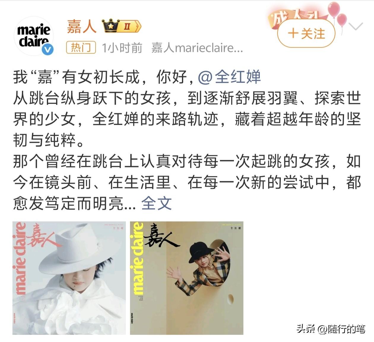 不得了,全红婵登上了五大杂志之一的《嘉人》杂志封面,拍摄的多张时尚大片,在27日公布出来了。 不得不说,这消息事前是保密得密不透风,完全没有人知道。 而在今天公布出来也是专门挑的好日子,27日也是全红婵在老家迈合村的新房子室内装修举办开工仪式的一天,而且明天28日还是全红婵19岁的生日,一连串的好事接连发生,在没有跳水比赛的日子里,全红婵这段时间真的是喜事连连。