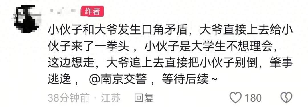 如果说是大爷应该是年老体弱,可这个所谓的大爷不仅行动迅速,而且逃跑的速度非常快,应该严惩!据逐浪新闻报道,江南南京一大爷与一大学生在马路上发生矛盾,大爷一拳打在了大学生生脸上,大学生为了息事宁人没有理会而是骑车走了,可大爷不依不饶骑车上去直接别倒了大学生,然后骑车逃逸。幸亏此事被他人全程录了下来,让大学生报警处理。现在问题到了南京交警那里,看怎么发通报吧。