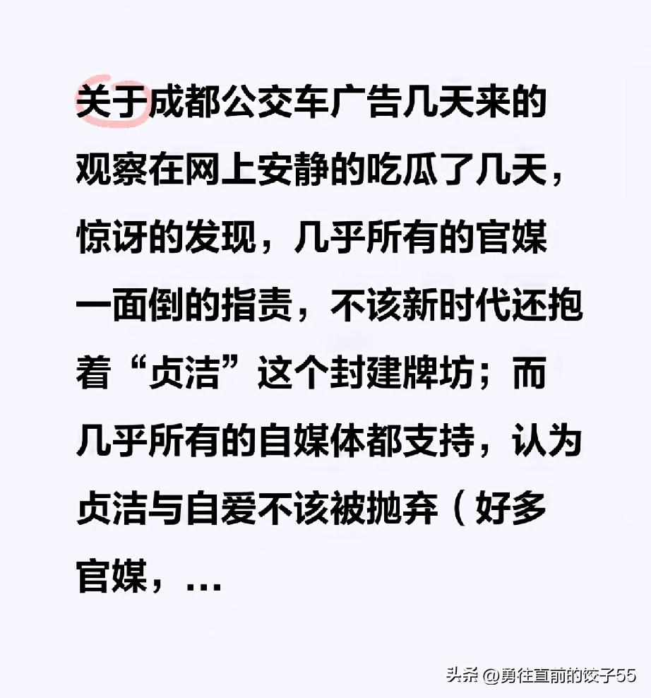 近几日成都公交车上打出广告,宣传女儿要“贞洁”引发热议,随后多家官媒发文批评这种广告,认为这种宣传方式不符合新时代的价值观,不应该再抱有“贞洁”这种封建的思想意识。 但是,各大自媒体和头条上的大v,却大多数支持这种广告,认为“贞洁”和“自爱”应该被珍视,而不是被一棍子打死。也有不少网友表示很惊讶,没想到如今的官媒会是这种态度,以后是不是可以多打一些支持“三通一达”等商业化内容的广告?