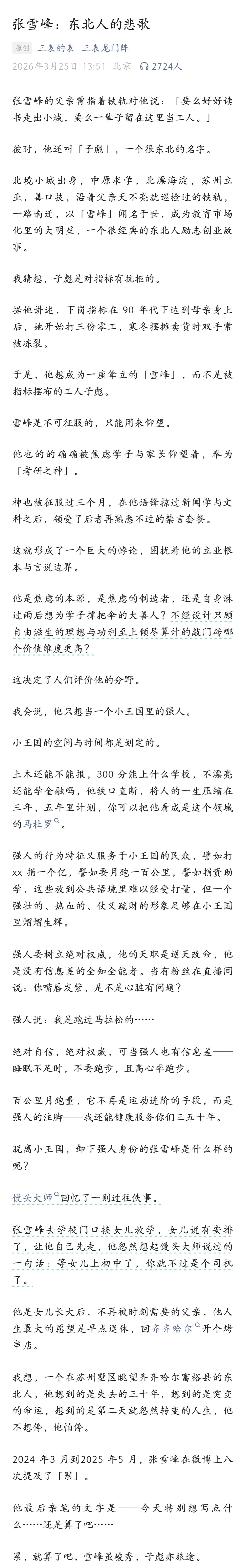 略懂书生 1 2026-03-27 20:09 怀念张雪峰,实际上怀念那个曾经的自己。虽然他在东北,我在西北。但是感觉他做到了我曾经的梦。同样靠着高考高考改命,他成功了考上了郑州大学,我差点成功只考上了一个大专。毕业后他通过奋斗,现在成为三家公司老总,但是我没有他的能力,现在还只是一个小职员,随时失业。但是有一个情况都一样,什么呢?忍耐,不舒服,忍忍吧。腰突,强直性脊柱炎,耳鸣,神经衰弱,脂肪肝。不舒服了怎么办,忍忍吧。现在他走了,去天上做文曲星了。我也在忍耐,也在等待…不知道最后能熬到终点,还是半途脱轨。