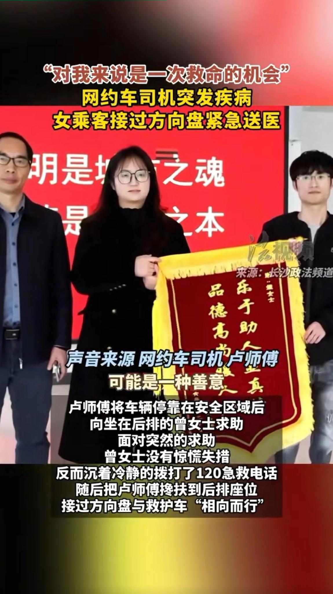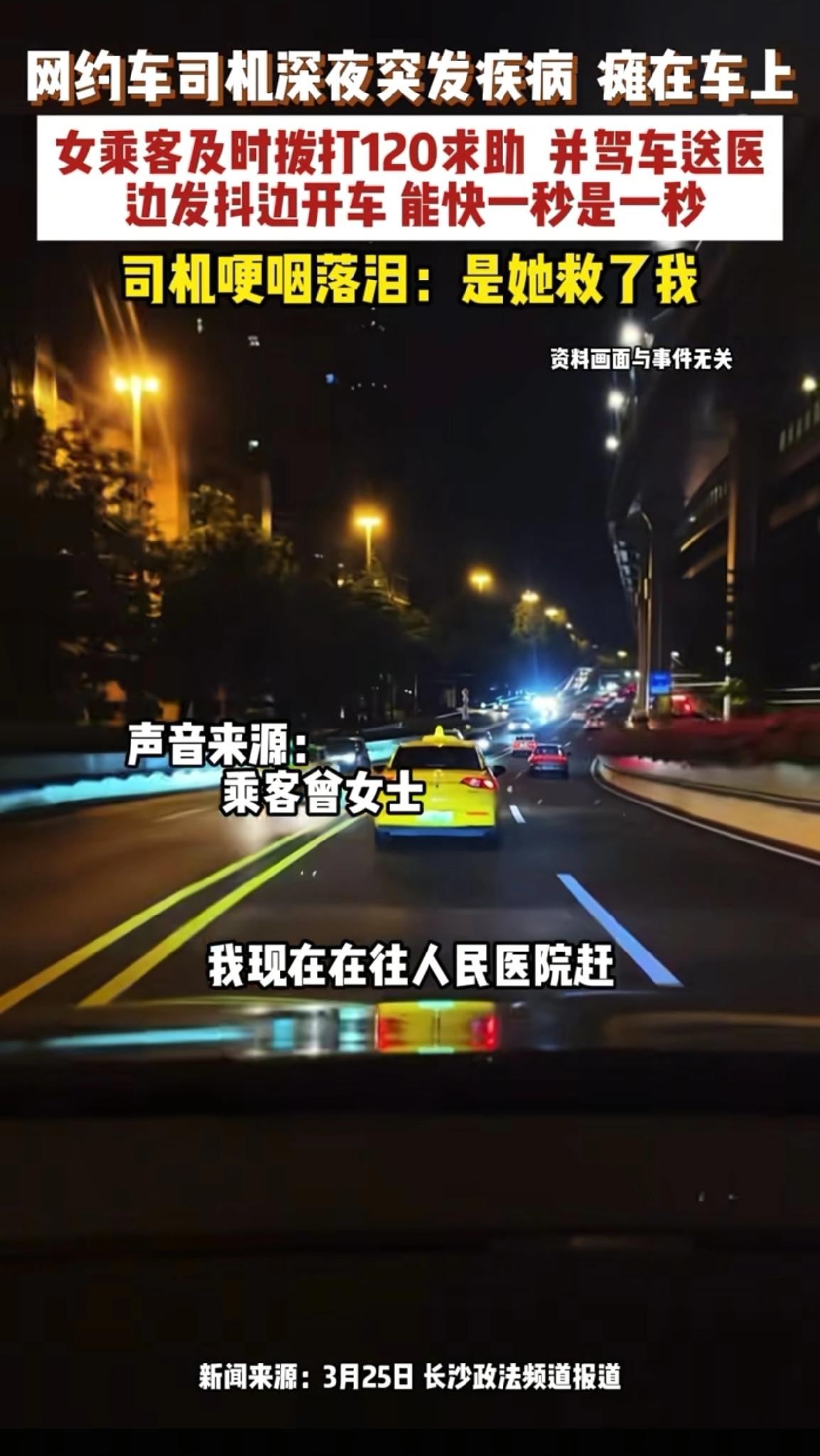 湖南,一网约车司机在接单途中突发疾病,于是他向后座的女乘客求助, 没想到女乘客 二话不说接过方向盘,上演了一场生死时速。这一幕,让司机感动万分。 事发在3月15日晚上十点左右,这位网约车司机卢师傅正驾车从永州新田县前往长沙,车上搭载的是顺风车乘客曾女士,原本只是一趟再普通不过的行程,谁也没料到意外会突然降临。 在这个快节奏社会,大家都行色匆匆。可这两位陌生人,一个身处困境,一个果断援手,让我们看到人性的闪光点。女乘客没有丝毫犹豫,展现出的果敢与善良,实在难能可贵。 网约车司机日常奔波,风险难测,而这次意外,却因陌生人的善意有了温暖结局。其实生活中,咱都可能遇到困难,也都有机会成为他人的光。你说,要是你碰到这情况,你会怎么做?
