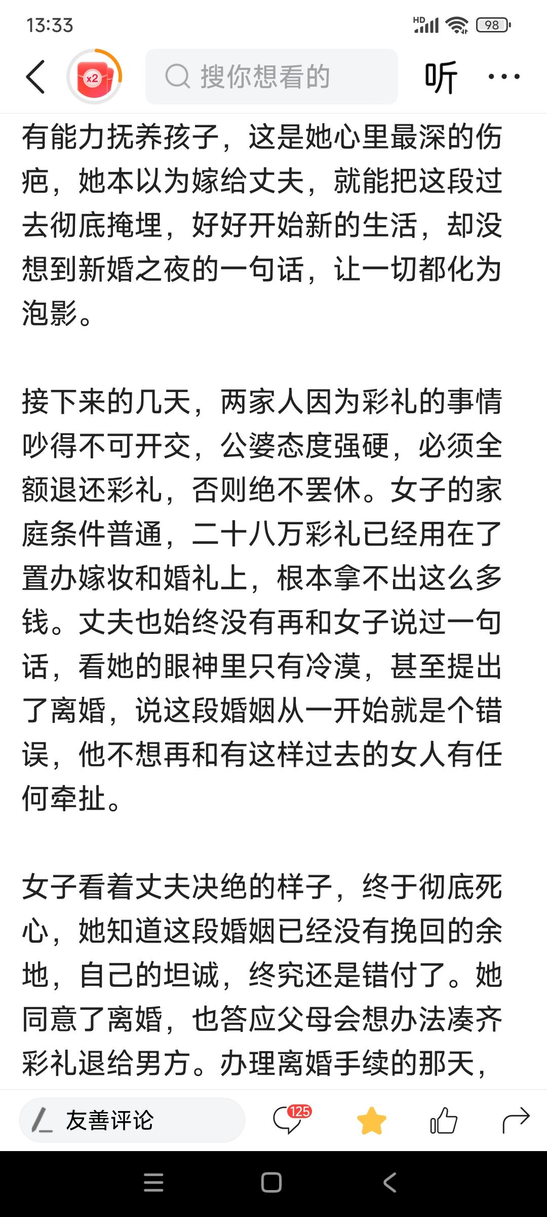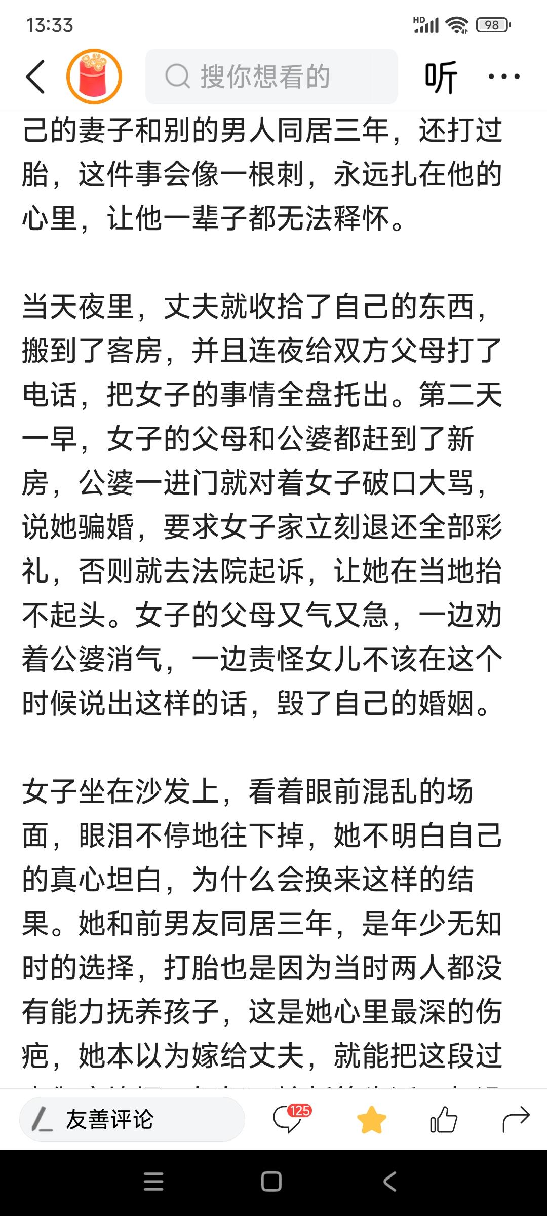 这样的结局并不意外! 新婚之夜,夫妻深入交流后,面对丈夫是否生过孩子的疑问,女子坦白和前男友同居三年,未生育,但打过一次胎! 结局不出意外。丈夫很生气,指责妻子是欺骗,最后双方不欢而散! 女方觉得委屈,说自己是真心坦白,没想到却换来这样的结果。她还辩称自己不是故意隐瞒,是太爱丈夫,是珍惜这段感情,怕提前说出来会让这段感情走到尽头。 姑娘呀,你的“真心坦白”是大打折扣的!如果丈夫不问,你还会主动坦白吗?如果是真心坦白,你至少应该在领证举办婚礼前把实情告诉丈夫。他能接受,就会娶你;若接受不了,就及时止损,就不会有后面的悲剧了! 你那个因害怕失去,不敢提前告知的说法也是不成立的。如果有男子和姑娘结婚后才告诉她,自己身患重病(表面不容易看出来那种),是因为太爱姑娘,害怕失去才不敢告诉她,你觉得这姑娘会有什么反应?她会不会生气离开? 据说男方为了结婚花了近50万,其中彩礼就给了28万。这是头婚娶黄花闺女的标准了吧?你倒好,和前男友同居了三年,还打过胎,除了没生下来孩子,你和二婚女人有什么区别?你说丈夫能不觉得憋屈吗? 你说和前男友同居是年少无知时的选择,无知的时间不短嘛,双方的父母也无知吗?你说打胎是因为双方都无力抚养孩子,那你们为什么要同居,要怀孕呢? 那男方就没有一点错误吗?有,就是没有提前问清楚。现在未婚同居的人真不少!