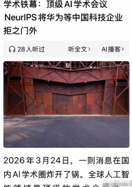 将中国排除在外! 世界顶级人工智能大会将华为等中国科技企业排除在外,理由是上了美国制裁名单。还记得当年很多人鼓吹科技无国界,甚至教育无国界。 NeurIPS 创办于 1987 年,原本是聚焦机器学习与计算神经科学的国际学术平台,一直被视作全球 AI 研究成果展示与交流的最高殿堂之一,也是中国计算机学会推荐的 A 类顶会。 可这次它却以 “遵守美国法律” 为借口,把 OFAC 制裁名单当成学术准入门槛,完全无视学术交流开放、平等、包容的基本准则。 要知道,华为每年产出的 AI 论文超千篇,在全球 AI 研究中占据重要分量,商汤、旷视等企业更是在计算机视觉等领域走在世界前列,这些机构的科研成果,本应是全球 AI 进步的重要组成部分。 此前多年,“科技无国界”“教育无国界” 的说法被反复提及,不少人坚信知识与技术的传播不该被国界、政治所阻隔,全球科研合作本应是推动人类进步的核心动力。 可现实却狠狠打破了这份理想化的认知,当中国科技企业在 AI、5G 等领域逐步崛起,触及到部分国家的科技霸权时,所谓的 “无国界” 瞬间变成了有选择的 “国界”。 美国先是以国家安全为由,将华为等大量中国科技企业列入制裁清单,限制技术合作、芯片供应,如今又通过学术顶会的规则,直接剥夺中国科研机构在全球顶级学术平台发声、交流的权利,从产业到学术,形成了一套完整的封锁链条。 面对这种公然将学术交流政治化的行为,中国学界迅速做出反击。3 月 25 日,中国计算机学会(CCF)发布声明,坚决反对 NeurIPS 的歧视性做法,倡议全体中国计算机领域科研工作者拒绝为该会议提供审稿、编辑等所有学术服务,也不再向其投稿,还明确表示若对方不纠正错误,将把 NeurIPS 移出学会推荐目录。 3 月 27 日,中国科协也发布声明,停止受理学者参加 2026 年 NeurIPS 会议的资助申请,相关申请转至国内会议或其他秉持开放原则的国际会议,且本届 NeurIPS 收录的论文,将不被认可为中国科协项目的代表作成果,多位国内学者也公开表态,婉拒担任 NeurIPS 的领域主席或审稿人,用实际行动维护学术公平。 这一事件也让更多人看清,所谓的 “科技无国界”,在霸权逻辑面前不过是一句空话。科学研究的本质是探索真理、共享成果,可当政治干预渗透进学术领域,全球科研共同体的根基就会被动摇。 中国一直坚持开放合作的科技发展理念,积极参与全球科研交流,可面对这种单边主义的封锁,我们只能选择自主自强,同时团结全球秉持公平原则的科研力量,构建更开放、多元的学术交流体系。 毕竟,科技进步从来不是某一个国家的独角戏,靠封锁、排斥无法阻挡全球科技发展的潮流,真正的学术繁荣,永远离不开平等、包容的交流合作。 这一事件也值得所有人深思,当 “无国界” 的理想遭遇现实的政治博弈,我们该如何坚守科研的初心,又该如何在复杂的国际环境中,守护自身的科技发展权利。 那么,你如何看待学术顶会将中国企业排除在外的行为?又如何理解 “科技无国界” 的现实意义?