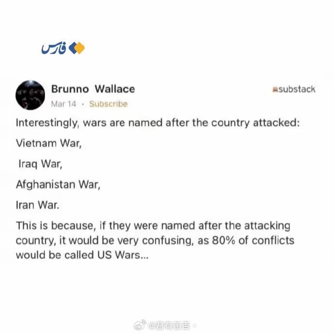 一位外国网友指出,有意思的是,战争通常是以被侵略国的名字命名的,比如越南战争、阿富汗战争、伊拉克战争等,因为如果以侵略国的名字命名,就会发现它们只有一个名字——美国战争。事实上,一般情况下,战争通常是以双方交战国的名字命名的,比如英法战争、日俄战争等,如果只有一个国家的名字,那就不用想了,多半是美国又入侵这个国家了